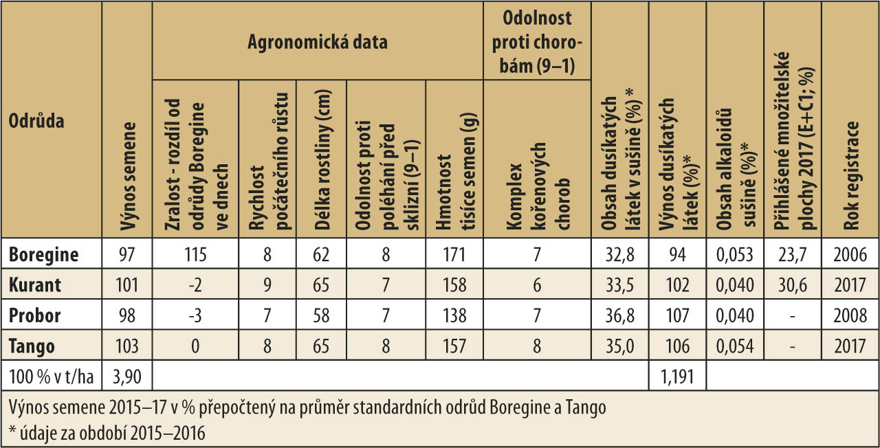 Přehled odrůd lupiny úzkolisté pro zásev 2018 obsahuje 4 odrůdy. Vedle již dříve registrovaných odrůd Boregine a Probor byly v roce 2017 registrovány odrůdy Tango a Kurant vyšlechtěné v Polsku.