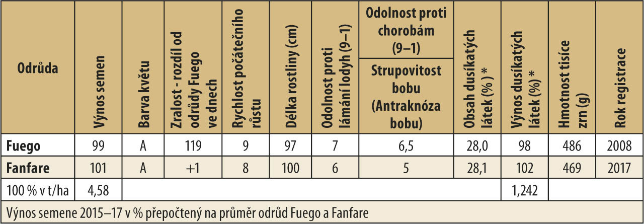 Přehled odrůd bobu polního pro zásev 2018 obsahuje 2 odrůdy. V roce 2017 byla registrována odrůda Fanfare vyznačující se velmi vysokým výnosem semene.