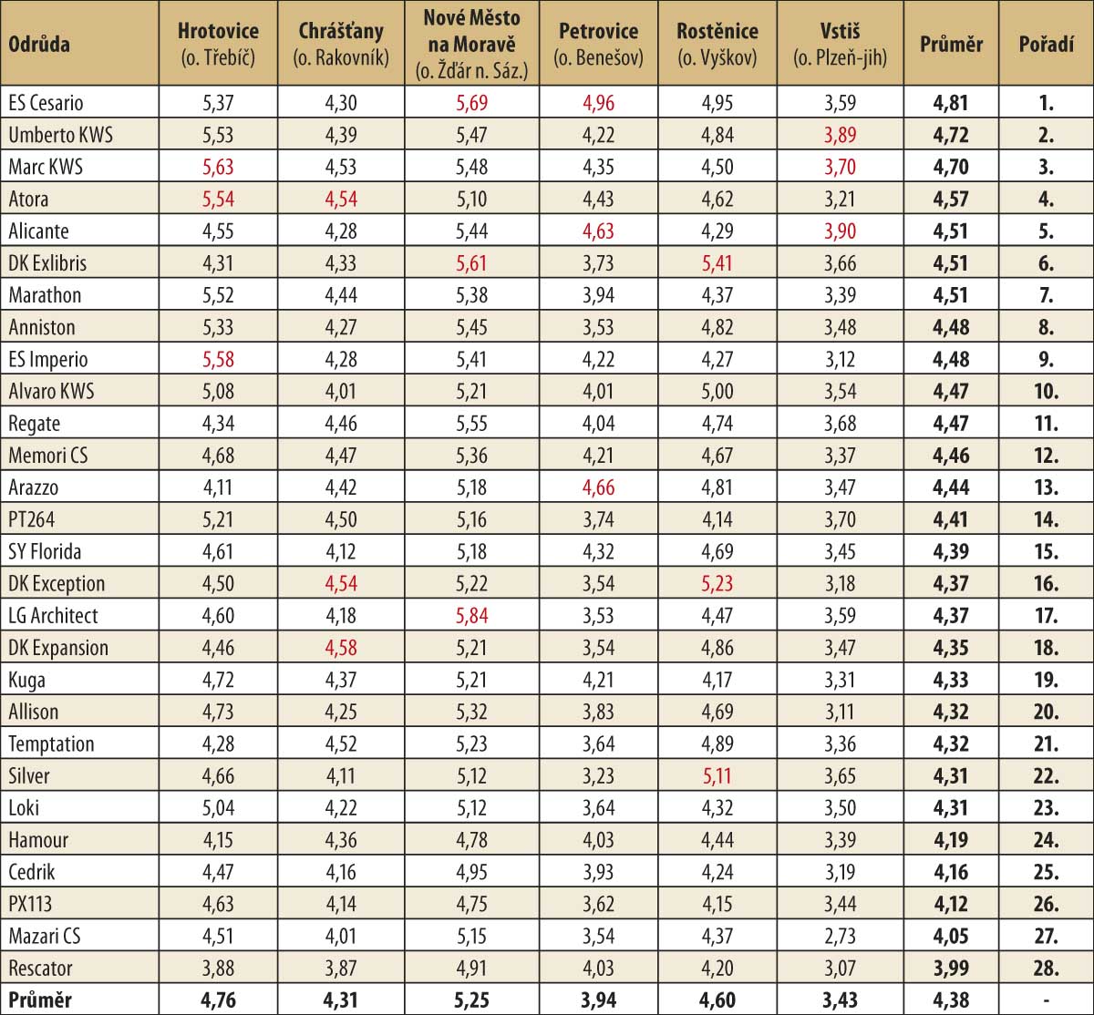 Pozn. V tabulce jsou uvedeny všechny vyhodnotitelné lokality (bez Humburk a Kelče). Tučně jsou označeny výnosy třech nejlepších odrůd na každé lokalitě. Červeně jsou u každé lokality vyznačeny výnosy třech nejlepších odrůd.