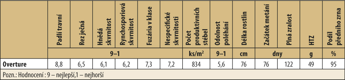 Overture je odrůda s vysokou odnožovací schopností, která tvoří vysoký počet produktivních stébel. Rostliny jsou středně vysoké se střední odolností vůči poléhání. Zrno má velké s vysokou HTZ 49 g, podíl předního zrna je velmi vysoký (95 %). Absolutní odolnost vůči padlí travnímu je kontrolovaná genem mlo. Velmi dobrou odolnost má proti rzi ječné a dobrou odolnost hnědé a rynchosporiové skvrnitosti. Je doporučeno ošetření morforegulátory proti poléhání. Velmi dobře reaguje na fungicidní ošetření zaměřené na listové skvrnitosti, přestože má velmi dobrý zdravotní stav (tab. 2).