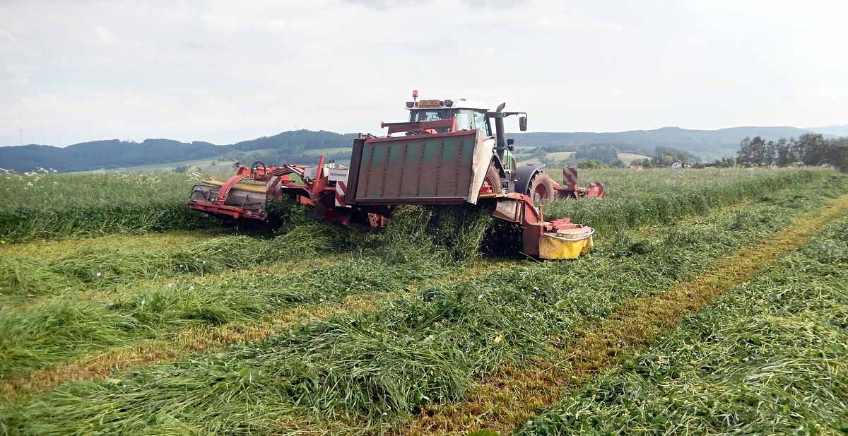 Obnovované porosty lučních směsí mohou i v suchých letech poskytovat vysoké sklizně píce, fotografováno při sklizni lučních směsí 23. 5. 2018 na Pícninářském dnu v Podkrkonoší