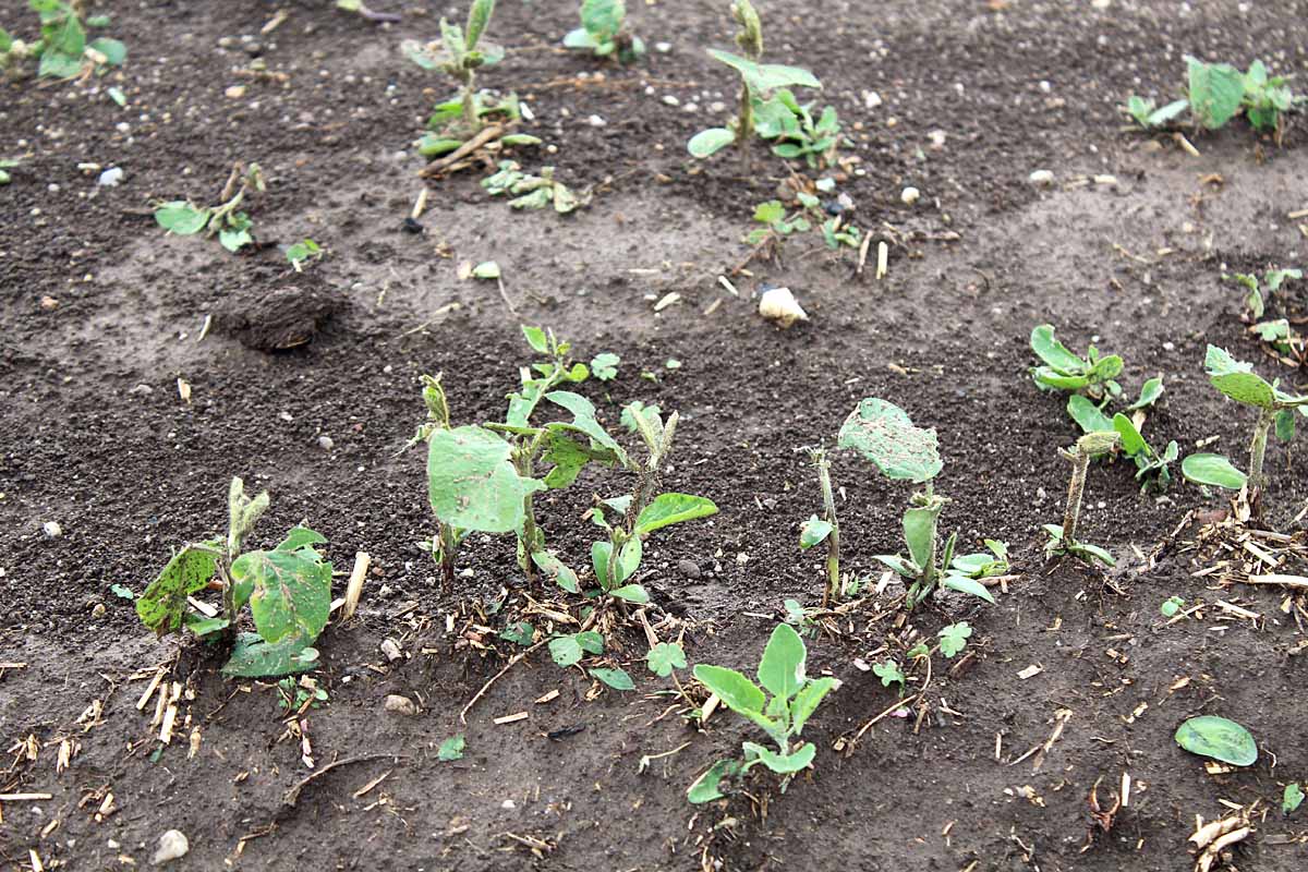 Porost vzešlé sóji poškozen krupobitím (Studeněves 24. 5. 2016)