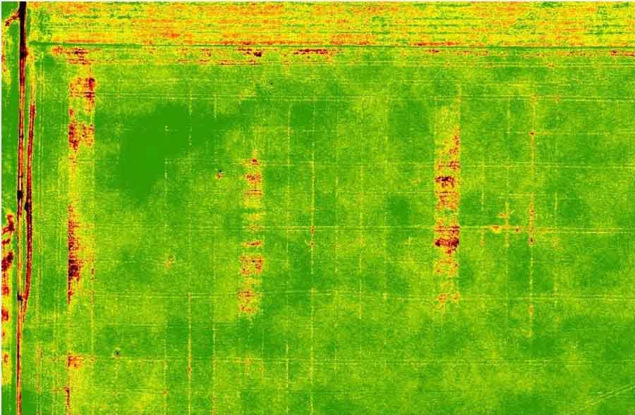 V rámci pokusů bylo také poprvé využito monitorování pomocí dronu, který byl použit k měření NDVI indexu (normalized difference vegetation index). Tento index udává odrazivost světelného spektra z vegetace a je jím možno sledovat rozdíly ve vegetaci, jak jsou rostliny stresované, například na základě rozdílné intenzity fotosyntézy. Stresované rostliny se pak zobrazují v barevné škále barvou červenou, nestresované zelenou. NDVI index se často používá k zobrazení rozdílů způsobených například rozdílnou, nedostatečnou výživou a na základě něho se pak vytváří aplikační mapy pro hnojení. V těchto pokusech bylo indexu použito k zobrazení rozdílů mezi rezistentními odrůdami a odrůdou kontrolní. Mapování, zobrazení i výpočet provedl ing. Radova Breuss ze společnosti Breuss Aircraft Works.