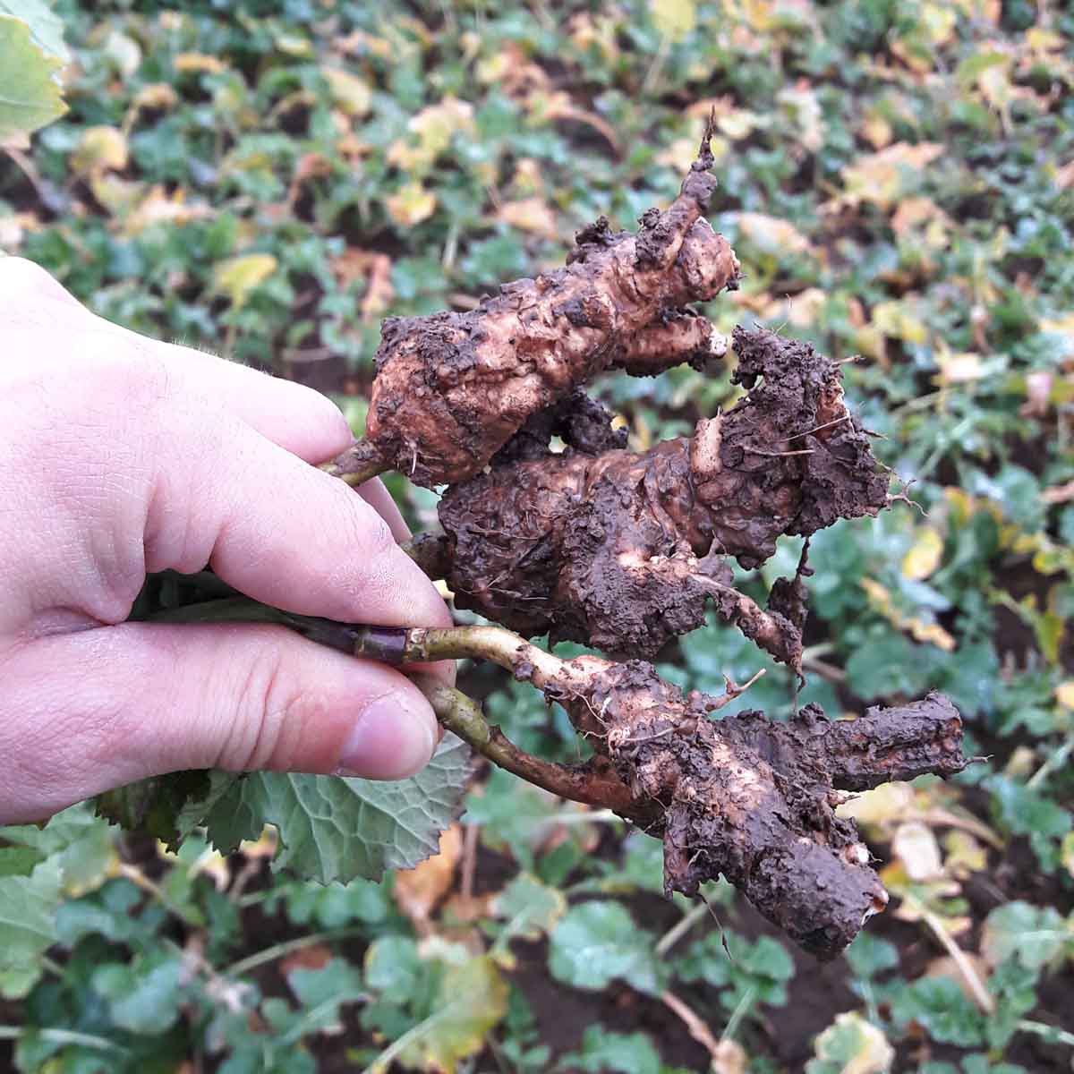 Obr. 4: Rozpadající se nádory způsobené patogenem P. brassicae na kořenech náchylné odrůdy, do půdy se uvolňují miliardy spor patogena, jaro 2018, Valdice
