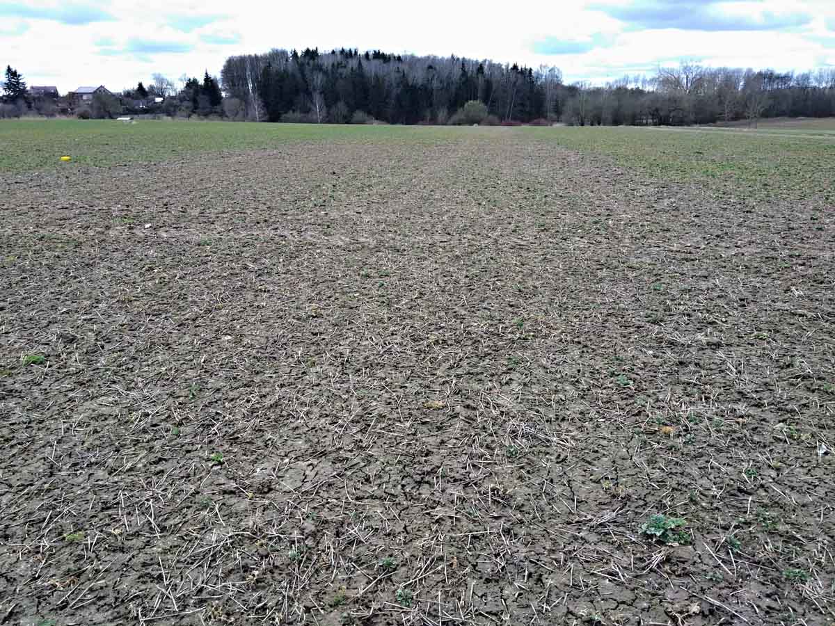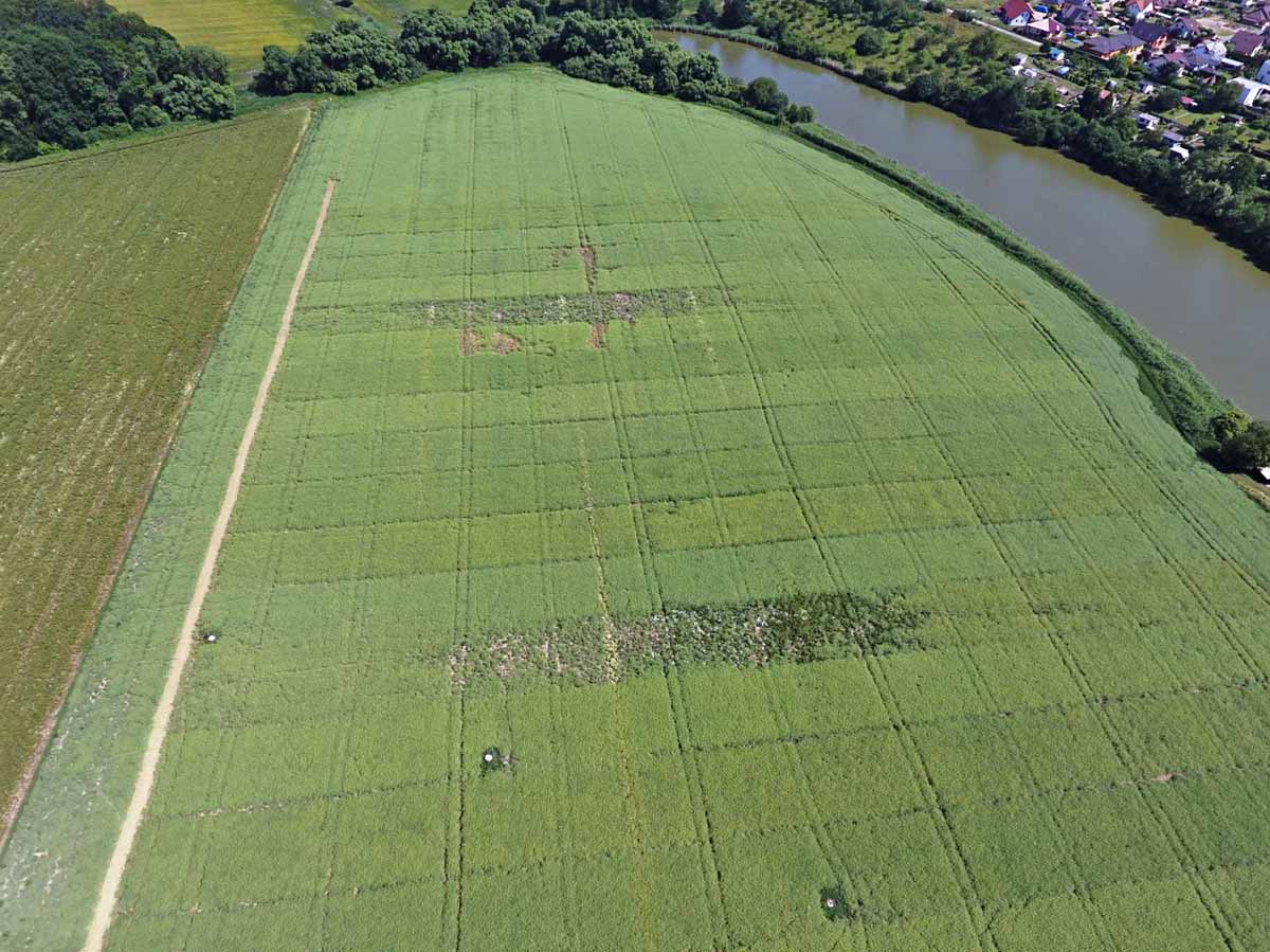 Obr. 7: Pohled na pokusný pozemek ve Valdicích na jaře 2018, snímek z dronu; na kontrolních parcelách je patrný úbytek rostlin vlivem působení patogena