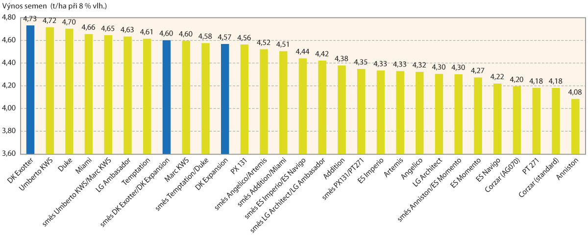Graf 1: Výsledky poloprovozních odrůdových pokusů 2019/20 (Ing. David Bečka, Ph.D., Agrada)