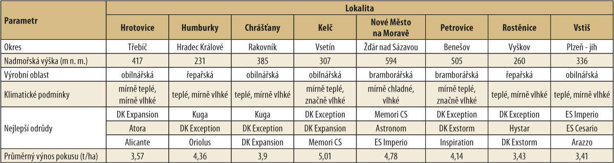 Nejvýnosnějšími odrůdou poloprovozních pokusů se s průměrným výnosem (4,61 t/ha) stejně jako loni stala nejpěstovanější odrůda ČR: DK Exception. Druhá příčka patří novince: DK Expansion (4,36 t/ha), po ní následuje: Atora (4,26 t/ha). Velmi dobrých výsledků dosáhly i novinky: Kuga a Memori CS. Nejvíce prvenství na jednotlivých lokalitách získaly: DK Exception (Kelč, Petrovice a Rostěnice) a Kuga (Humburky a Chrášťany). Výsledky z tabulky 1 jsou cenné, protože ukazují nejlepší odrůdy v jednotlivých klimaticky a půdně odlišných oblastech.