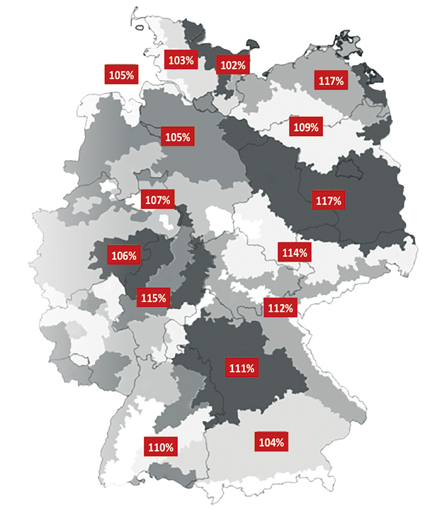Mapa 1: Relativní výnos (%) odrůdy LG Architect ve zkoušení LSV 2018 (Německo)