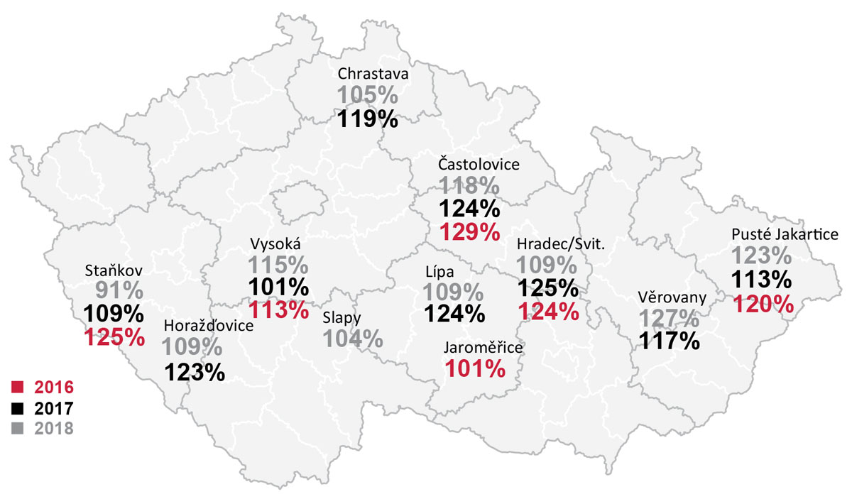 Mapa 2: Relativní výnos (%)odrůdy LG Architect na hodnocených lokalitách ÚKZÚZ (2016–18, ČR)