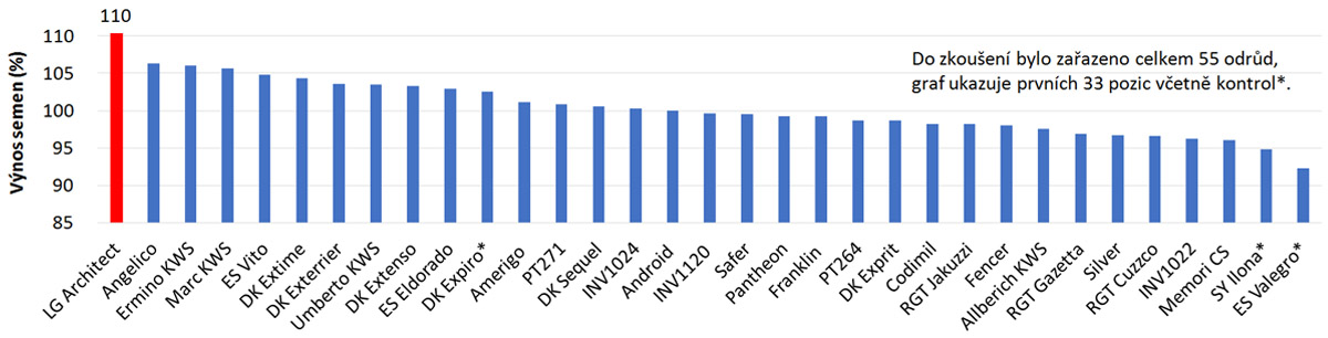 Na zadání, který hybrid řepky splní kritéria vysokého výnosu a jeho spolehlivosti, vystoupí na prvním místě jen jediný hybrid. Je jím LG Architect. Je nejvýnosnější nejen po loňské sezóně, ale i v předešlých dvou. LG Architect byl v ÚKZÚZ zaregistrován v roce 2018 s výnosem 117 % na kontroly coby nejvýnosnější hybrid na našem trhu. Podívejme se také na jistotu výnosu - za 3 roky zkoušení byl jeho výnos 24× z 25 případů vyšší než 100 % (mapa 2). Zároveň ve velkoplošných poloprovozních pokusech SPZO, sortimentu A, obsadil 2. příčku.