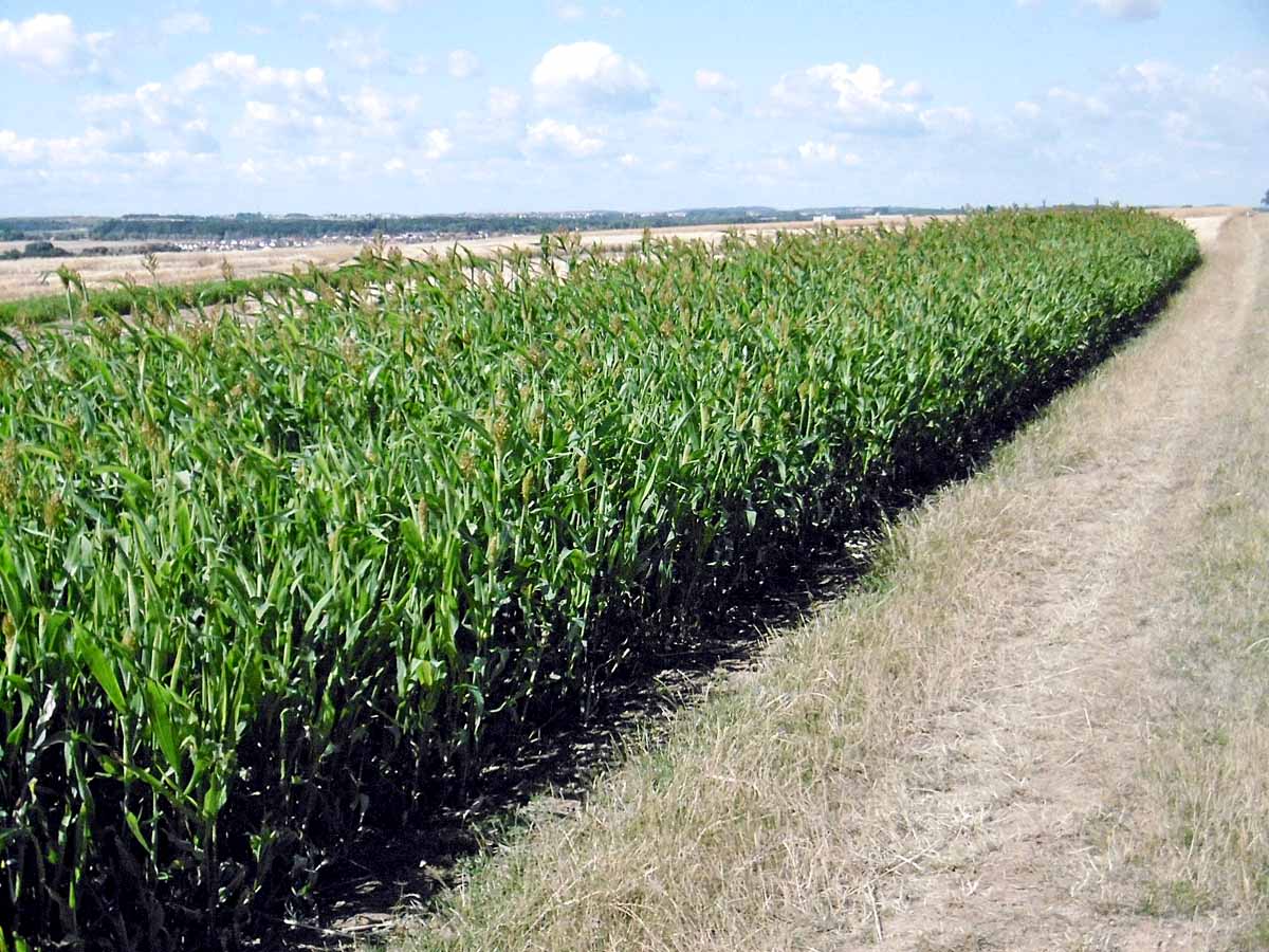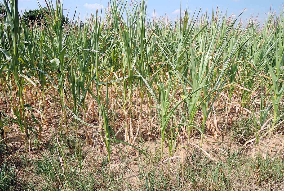 Vláhový deficit za extrémního sucha se projevil i na kukuřici (srpen 2015), i přes poškozené listy plodina poskytla relativně obstojný výnos