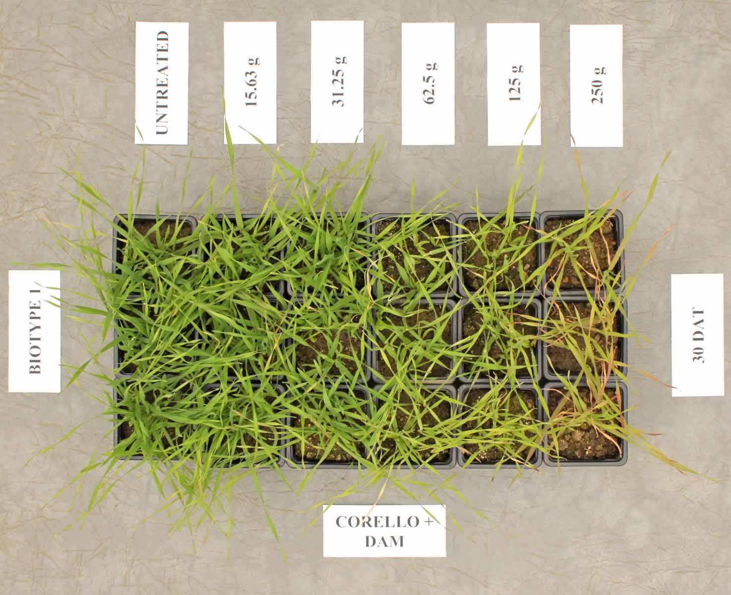 Obr. 1: Účinnost stupňovaných dávek herbicidu Corello - nosič DAM (30 dnů po ošetření)