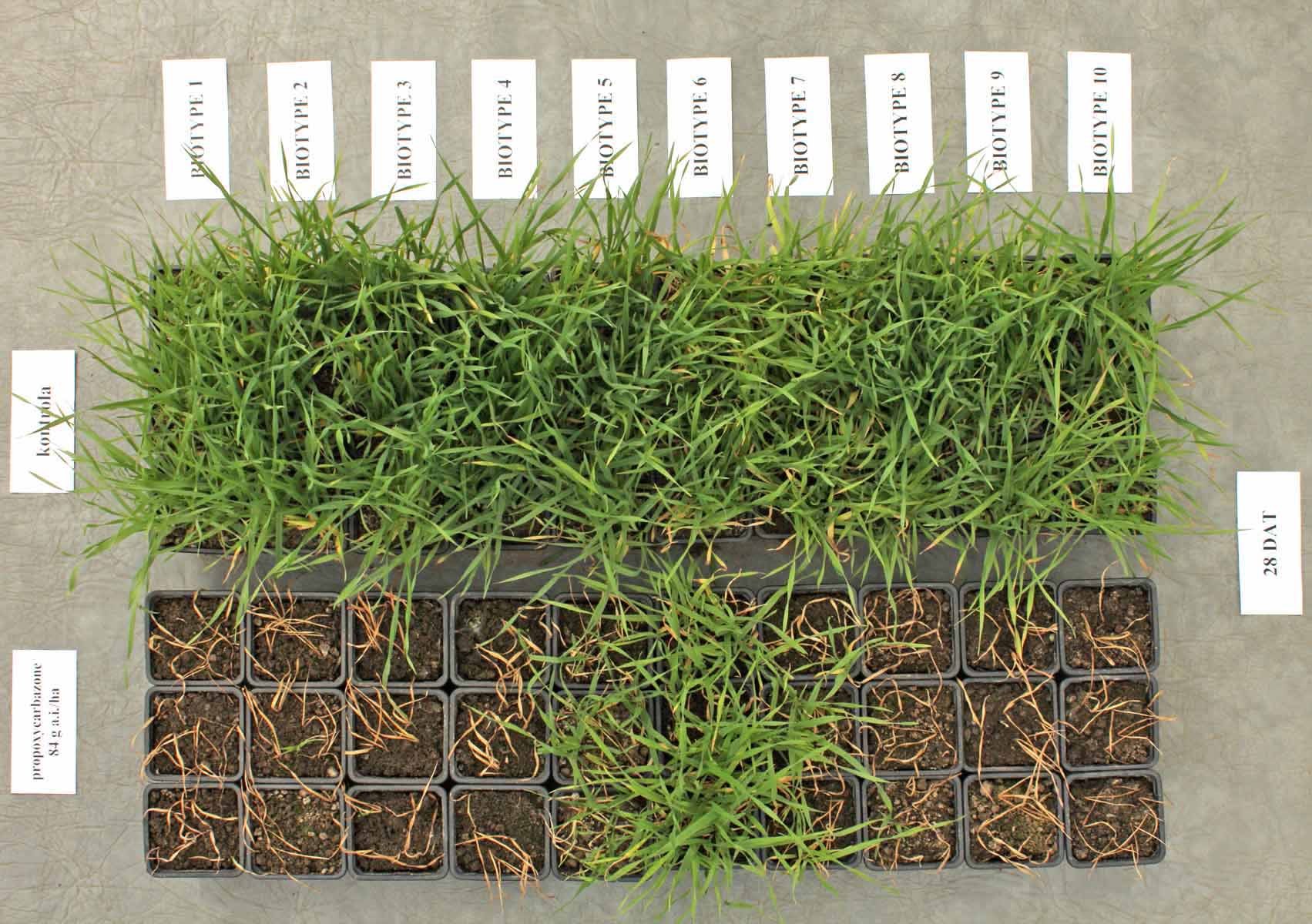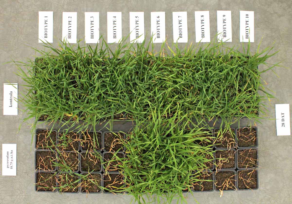 Mezi jednotlivými populacemi sveřepu jalového existují rozdíly v citlivosti k registrovaným herbicidům, ke kterým je nezbytné při jejich výběru přihlížet. Na jaře roku 2017 bylo otestováno 10 populací sveřepu jalového z pozemků od pěstitelů, kde selhala herbicidní ochrana přípravkem obsahujícím pyroxsulam. Obilky byly vysety do nádob a rostliny byly ve fázi 2 listů ošetřeny herbicidy na bázi pyroxsulamu, propoxycarbazonu a glyfosátu v registrovaných a dvojnásobných dávkách. Potomstvo ze 3 populací získaných z pozemků jednoho podniku přežívalo ošetření pyroxsulamem a propoxycarbazonem i ve dvojnásobných dávkách a bylo ohodnoceno jako silně rezistentní. Ostatní populace byly citlivé ke všem testovaným látkám, neboť účinnost na ně dosahovala 82–100 % (obr. 3 a 4). Selhání ochrany bylo tedy ve 2/3 případů způsobeno pravděpodobně aplikační chybou nebo průběhem počasí po aplikaci, ale je zřejmé, že bude nutné do budoucna počítat s dalším šířením rezistence, neboť 1/3 populací přeživších herbicidní zásah byla klasifikována jako rezistentní.