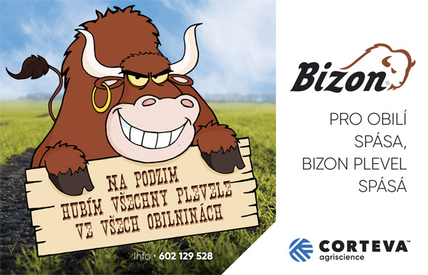 Výborný start ozimým obilninám umožní herbicid Bizon, který je univerzálem pro všechny ozimé obilniny (pšenice, žito, ječmen, tritikale) a velmi dobře působí na chundelku metlici a kompletní spektrum jednoletých dvouděložných plevelů, tj. heřmánky a rmeny, svízel, penízek, kokošku, úhorník, violky, rozrazily, hluchavky, ptačinec, chrpu, mák, pohanku, merlíky, lebedy, kakosty, zemědým (časnější fáze), rdesna, mléče a další plevele. K Bizonu je zbytečné přidávat cokoliv proti výdrolu řepky, zvládá ho perfektně. Příjemným bonusem je i nižší cena ošetření. Bizon má jednoduché dávkování 1,0 l/ha a praktické 5 l balení. Ideálním termínem pro ošetření je doba po vzejití obilniny (1.–3. list), kdy jsou vidět kolejové řádky a první plevele jsou již vzešlé. Přípravek hubí chundelku metlici a dvouděložné plevele reziduálně dlouhodobě přes půdu (až 6 měsíců), ale současně má účinek i přes listy na vzešlé plevele. Chundelka metlice nesmí mít v době aplikace více jak 3 listy. Teploty nad 5 °C a dostatečná půdní vlhkost zrychlují a zvyšují účinek. V případě potřeby lze Bizon aplikovat společně s Karis 10 CS nebo Rafanem Max proti přenašečům viróz, dále s kapalnými hnojivy, regulátory růstu, stimulátory atd. Pěstování následných plodin po ozimech ošetřených Bizonem je zcela bez omezení, po sklizni je možné vysévat řepku, obilniny, trávy na semeno a na jaře luskoviny, mák, cukrovku, sóju, slunečnici a další plodiny. Bizon je možno aplikovat v ochranných pásmech II. stupně ochrany povrchových zdrojů vod, na svažitých pozemcích a na pozemcích s drenážemi při dodržení pokynů uvedených na etiketě.