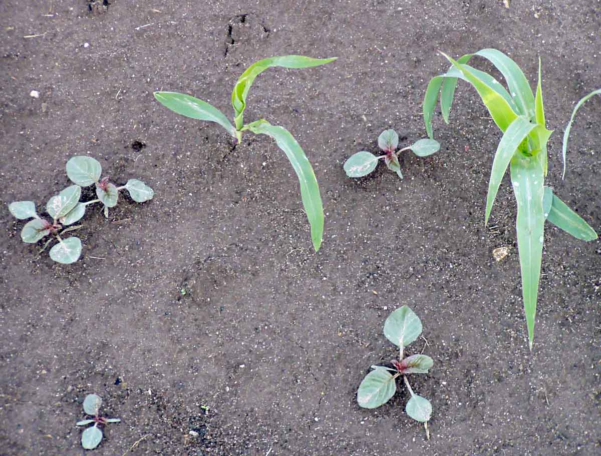 Obr. 4: Laskavec ohnutý vzchází obvykle až po vzejití kukuřice