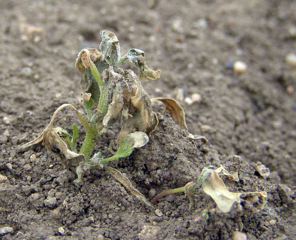 Silný vítr několik hodin či dní před aplikací může negativně ovlivnit také selektivitu některých herbicidů, zejména u citlivějších plodin, jako je cukrová řepa, luskoviny, či zeleniny. Větrem unášené částečky půdy mohou totiž poškozovat povrch listů, zejména v raných růstových fázích plodiny, kdy není porost dostatečně zapojený a rostliny jsou pak citlivější k herbicidnímu ošetření (obr. 6).
