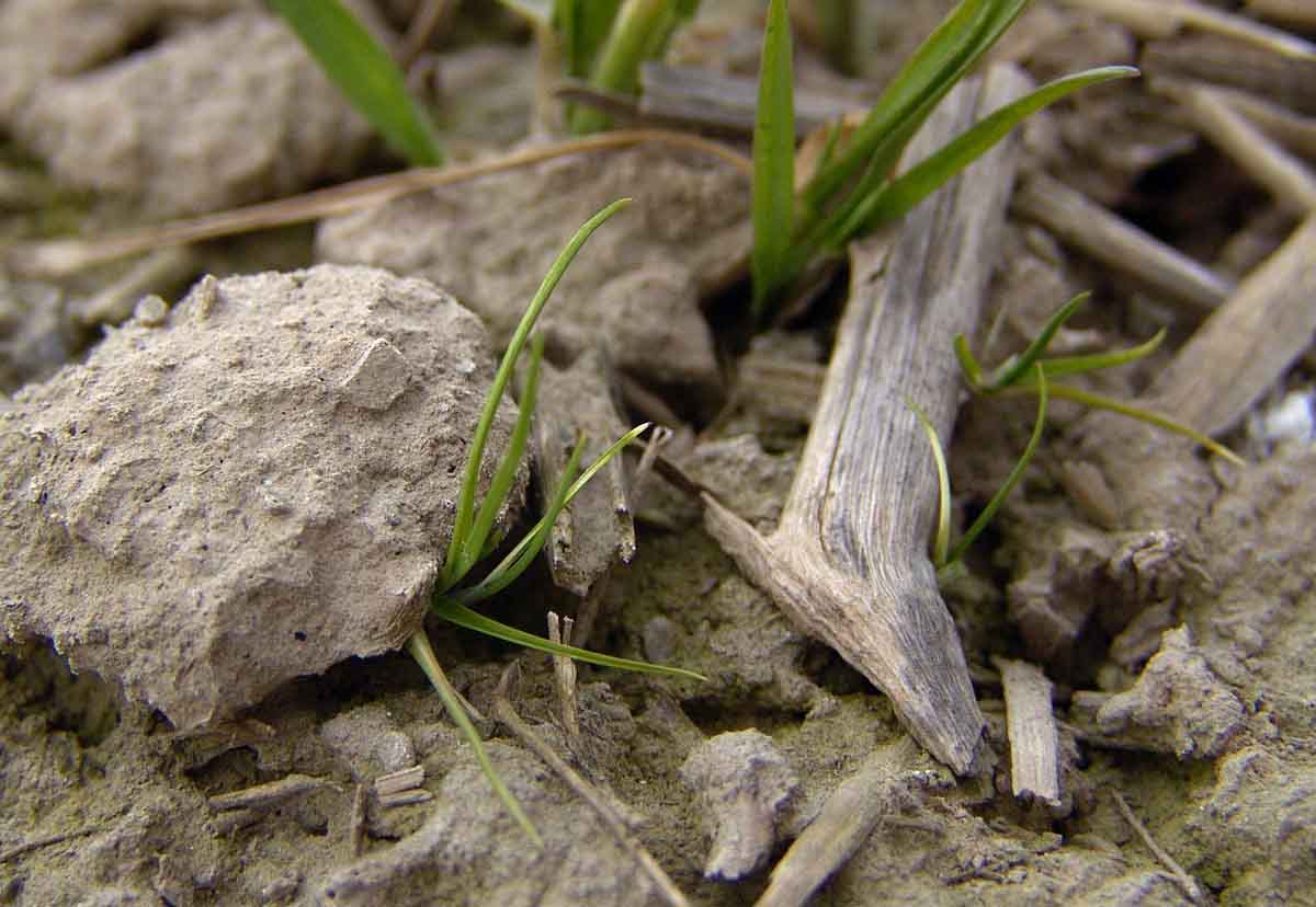 Obr. 10: Po zeslábnutí reziduálního působení půdních herbicidů mohou plevele (na obrázku lipnice roční) vzcházet zpod hrud a rostliných zbytků na povrchu půdy