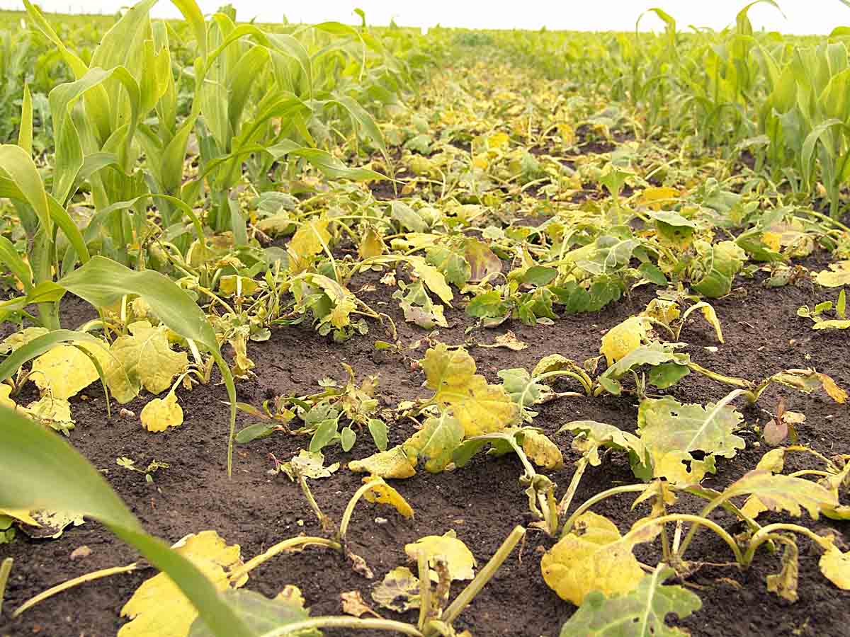 Obr. 1: Pokud je ošetření kontaktními listovými herbicidy provedeno ve vyšších růstových fázích plevelů (na obrázku merlík bílý po aplikaci phenmediphamu), může docházet k regeneraci (obrůstání) plevelů z adventivních pupenů