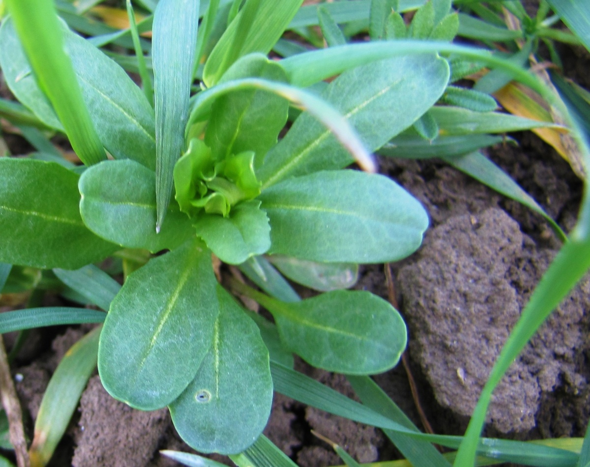 V porostech ozimých obilnin se vyskytuje přibližně pět plevelných druhů, nejčastěji jednoleté přezimující plevele. Jednoleté přezimující plevele vzchází na podzim, vytváří listové růžice, na jaře regenerují rychleji než plodina a mají předstih v přístupu k živinám a slunečnímu záření. Jedná se zejména o: heřmánek nevonný (obr. 1), mák vlčí (obr. 2), penízek rolní (obr. 3); jiné plevele vzcházejí v pozdějším podzimním období: violka, rozrazil břečťanolistý (obr. 4), chundelka metlice; nebo vzchází nepravidelně ve vlnách, např.: svízel přítula, chrpa modrá (obr. 5). Výrazná konkurence plevelů nastává u řídkých, časně setých porostů. U řídkých pozdě setých porostů může docházet k zaplevelení typicky jarními plevelnými druhy, jako jsou opletka obecná, konopice polní, oves hluchý.