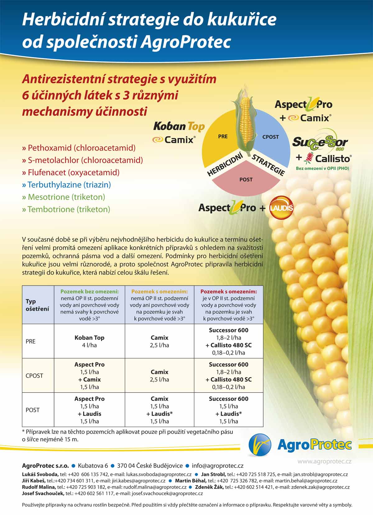 Herbicidní ochranu kukuřice není možné řešit jednotným standardním postupem, protože vlhkostní podmínky v období setí kukuřice jsou každý rok rozdílné. Proto je třeba nabídnout takové přípravky, které dokážete využít v době vlhka preemergentně, ale nastane-li sušší období, použijete tytéž přípravky spolehlivě v časně postemergentním termínu. Přípravek tak nezůstane skladem. V současné době se při výběru nejvhodnějšího přípravku a termínu ošetření zohledňuje i omezení aplikace konkrétních přípravků s ohledem na svažitosti pozemků, ochranná pásma vod a další omezení. Podmínky pro herbicidní ošetření kukuřice jsou tudíž velmi různorodé, a proto společnost AgroProtec připravila herbicidní strategii do kukuřice, která nabízí celou škálu řešení.
