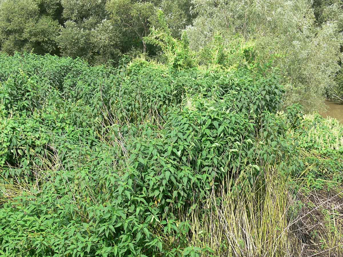 Slnečnica hľuznatá v inundačnom území rieky Uh, v pozadí ďalší invázny druh ježatec laločnatý (Echynocistys lobatum)