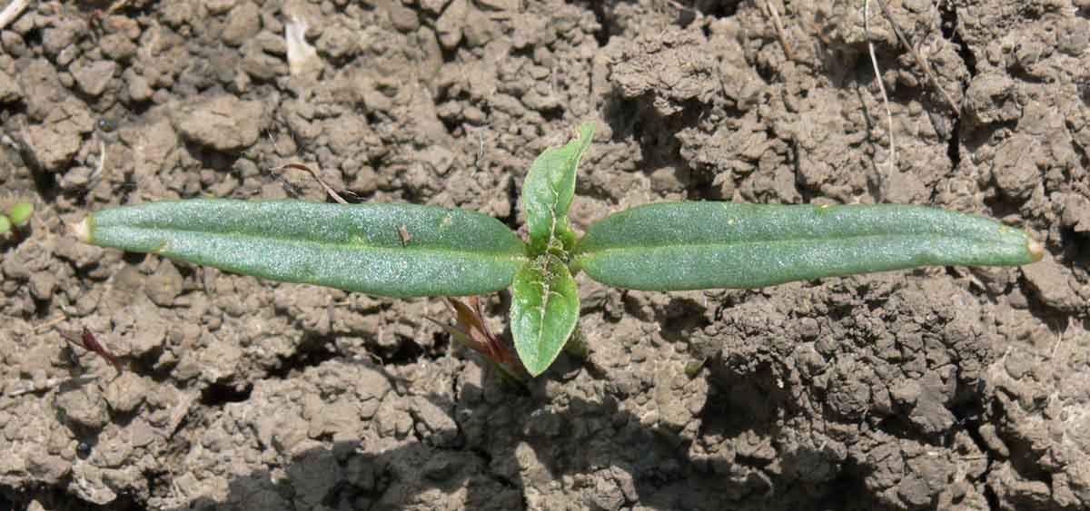 Klíčne listy 8–12 × 4–6 mm, vajcovito kopijovité, s krátkou stopkou, na konci ostro zakončené, jemne chlpaté. Hypokotyl husto ochlpený, fialovej farby.