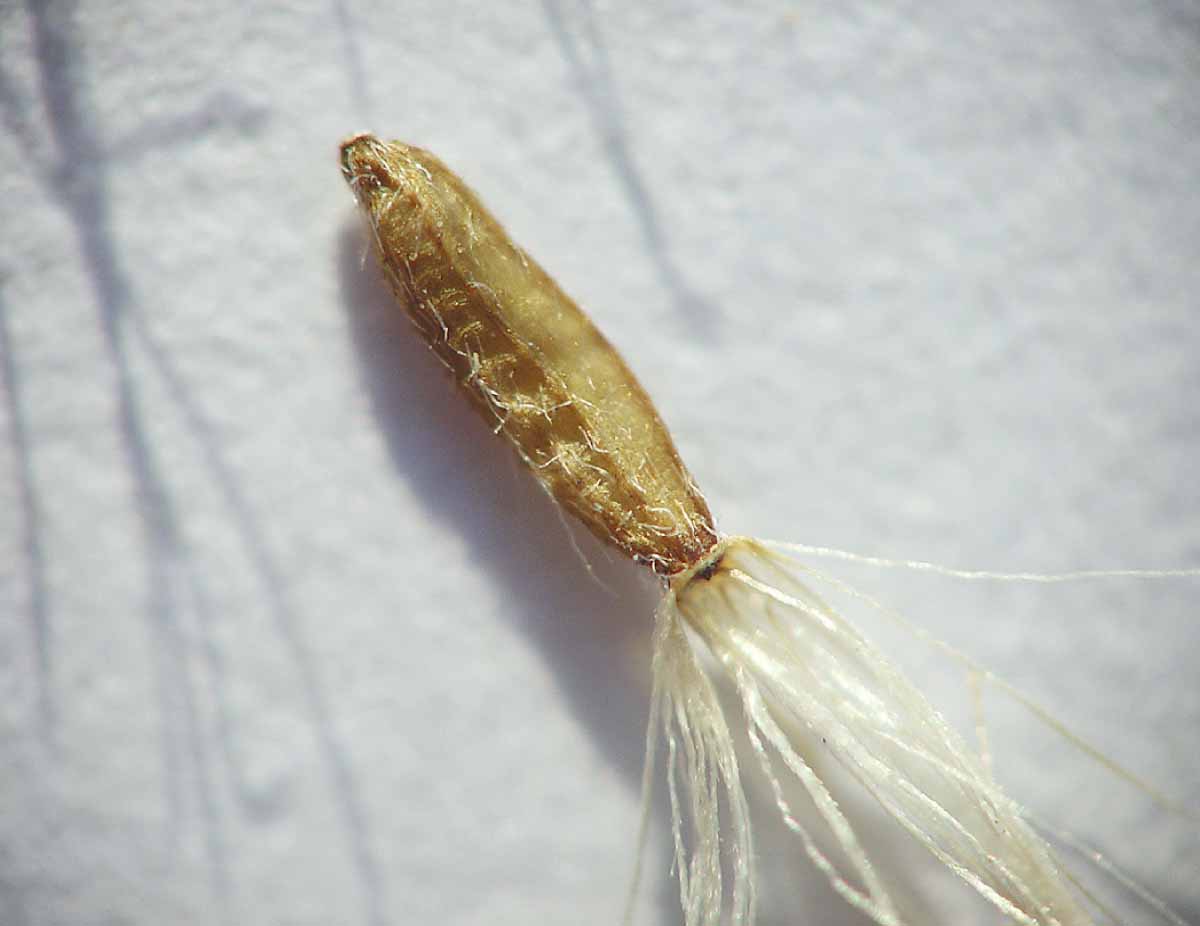 Listy striedavé, prisadnuté, kopijovité, ostro pílovité, smerom k hrotu postupne sa zužujúce, veľkosti 5–15 × 0,5–2 cm, na rube listu žilnatina chlpatá. Vedľa hlavnej žily sú dve dobre viditeľné postranné žilky. Úbory sú malé, vzpriamené usporiadané v hustých strapcoch na mierne prehnutých konárikoch tvoriacich metlinu. Zákrovy 2–3 mm veľké, koruna zlatožltá, jazykovité a rúrkovité kvety sú približne rovnako dlhé. Jazykovitých kvetov je 10–17, rúrkovitých 5–10. Plodom je nažka 1 mm dlhá, riedko plstnatá s páperím 2,5 mm dlhým. Kvitne v júli až októbri. Klíčne listy 3–4 × 2–2,5 mm, oválne, tupo zakončené, hypokotyl zelenofialový.