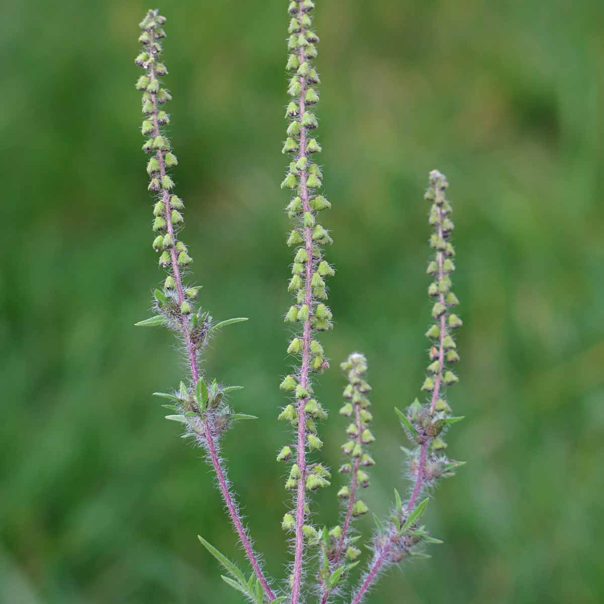 Kvetoucí rostlina ambrózie - v horní části se nacházejí samčí úbory, samičí květy jsou ve spodní části u úžlabí listů