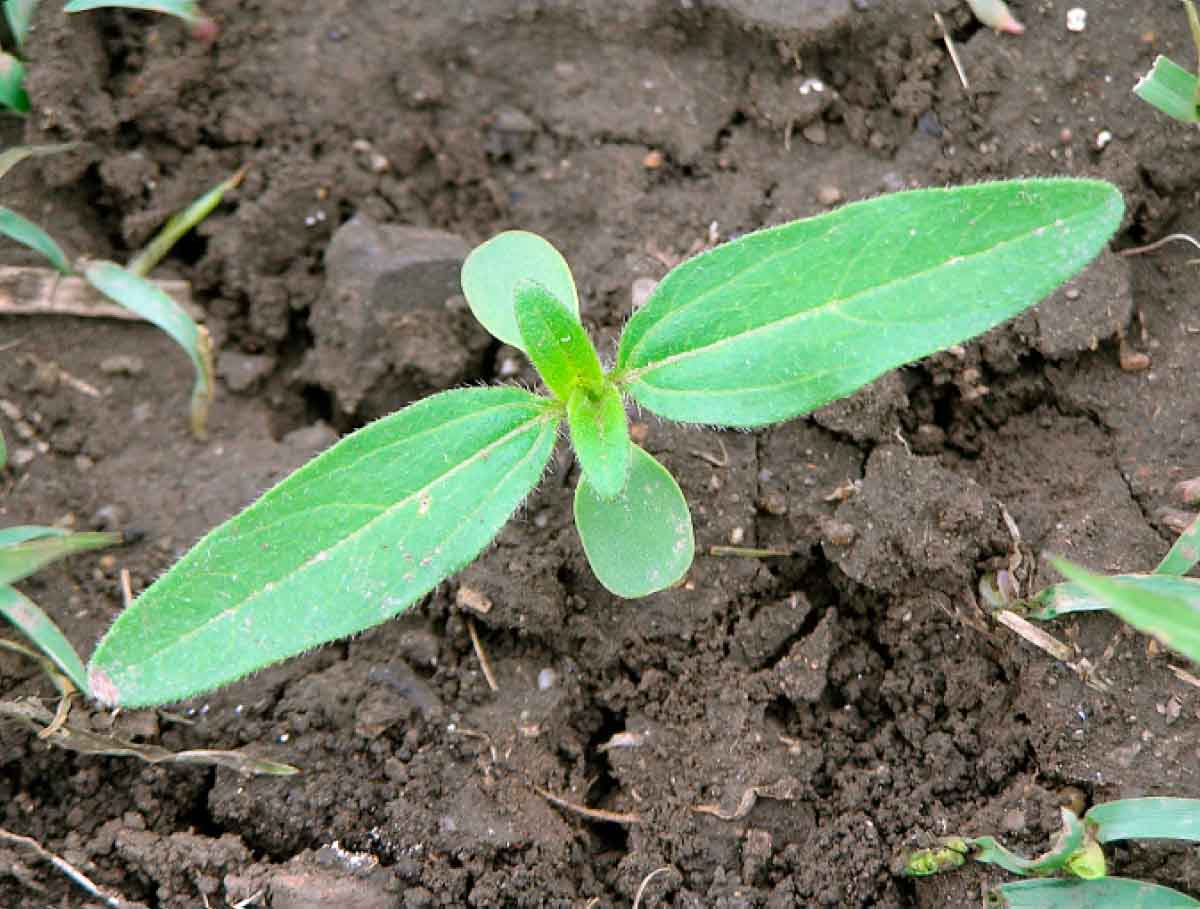 Klíční rostlina plevelné slunečnice s charakteristicky úzkými pravými listy