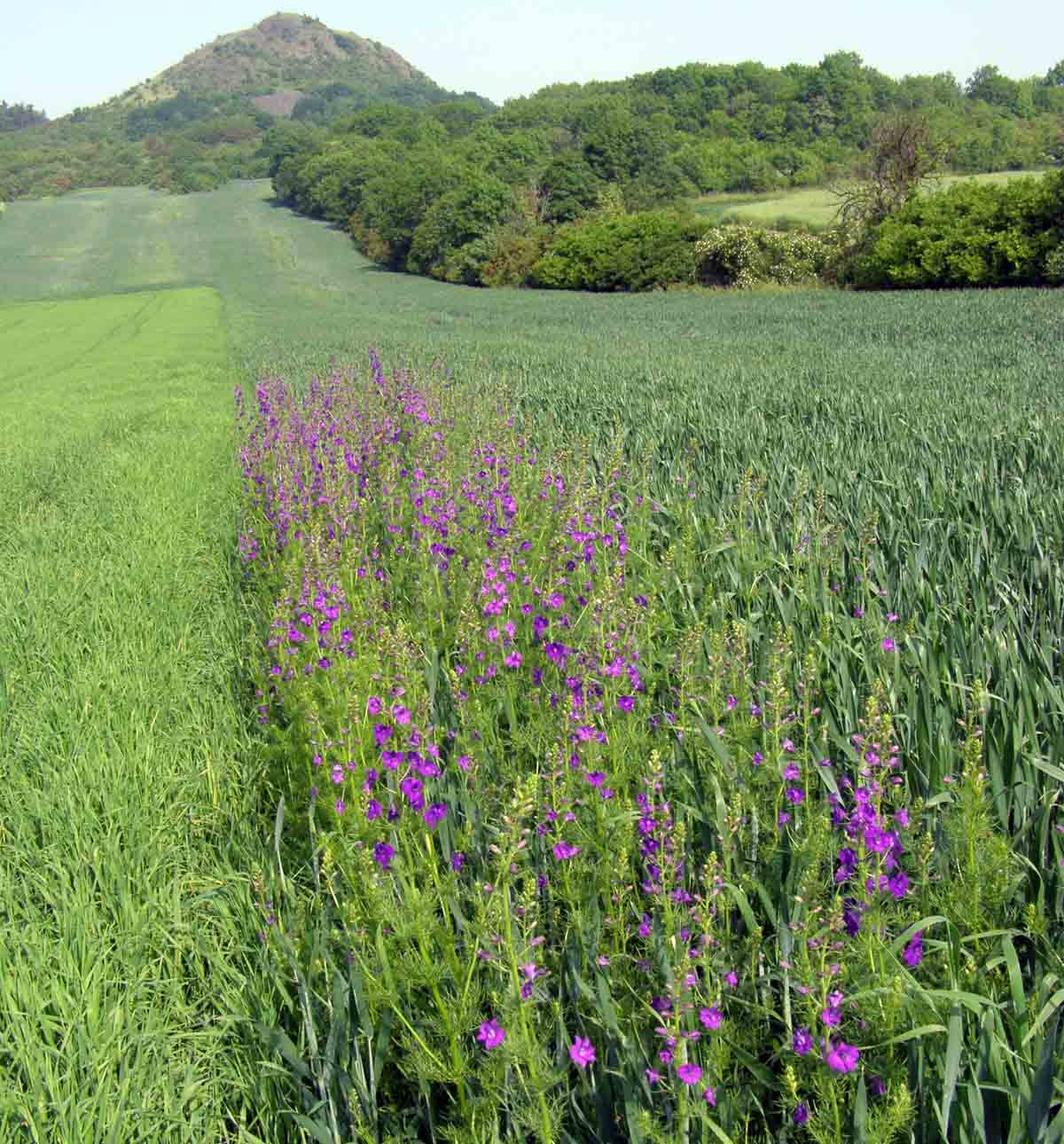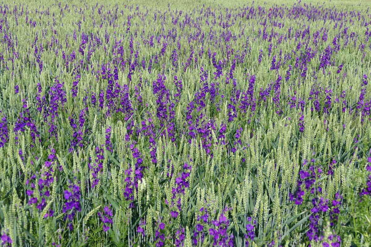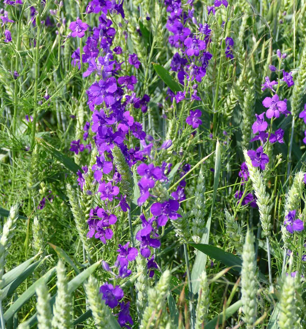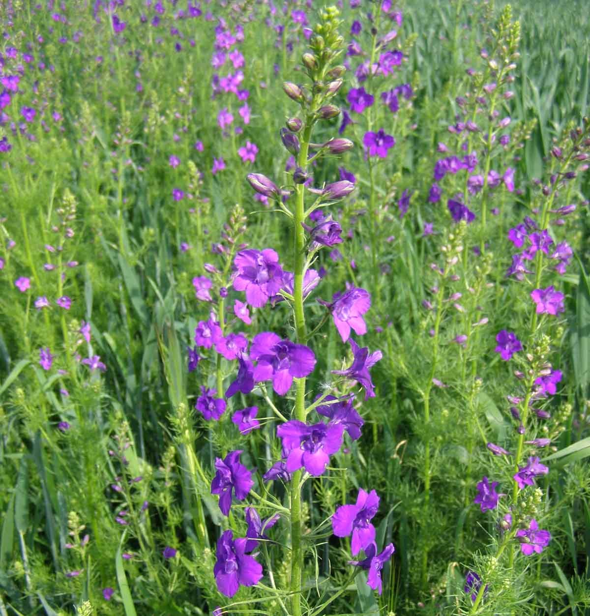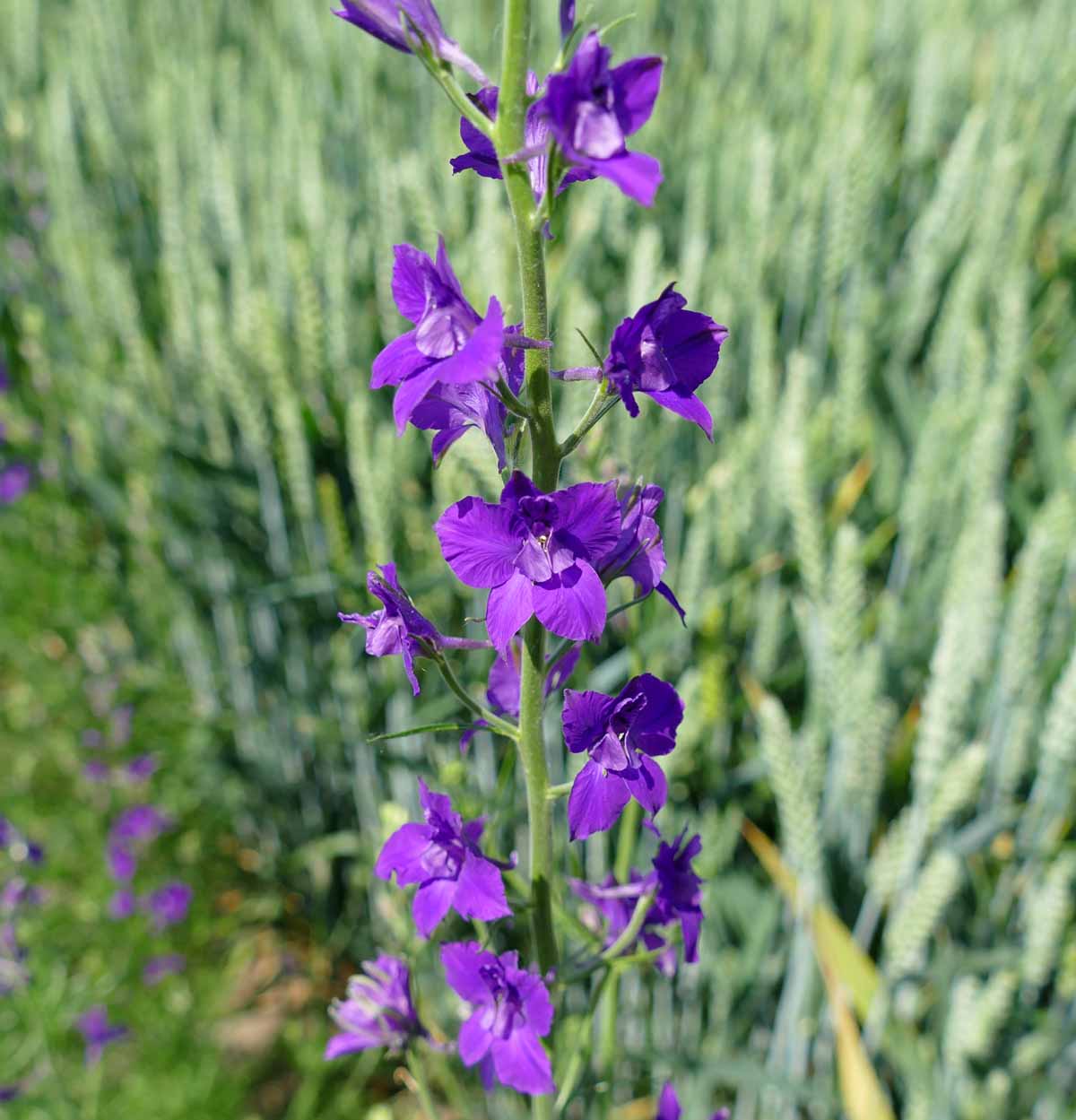 Ostrožka východní v době květu přerůstá porost obilniny a je na pozemku nepřehlédnutelná