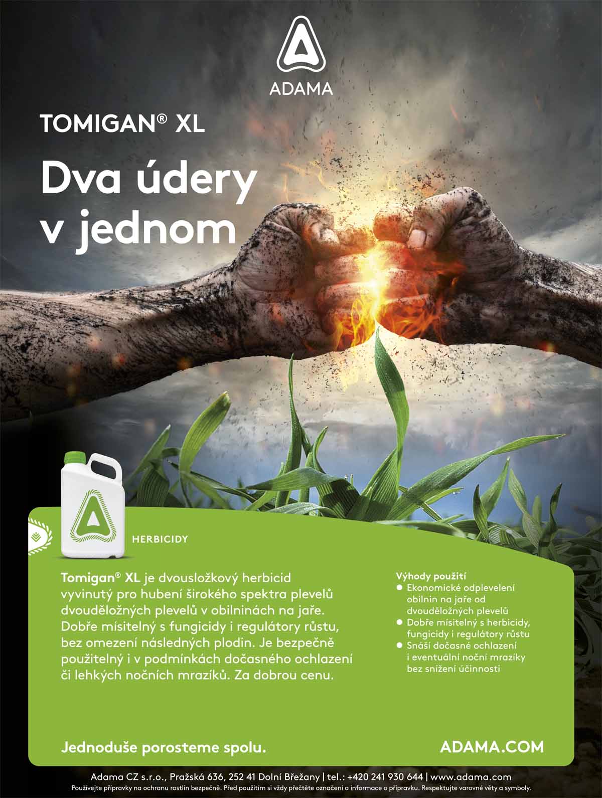 Dvousložkový herbicid Tomigan XL je novinka vyvinutá pro hubení širokého spektra dvouděložných plevelů v obilninách na jaře. Je dobře mísitelný s fungicidy i regulátory růstu, bez mezení následných plodin. Je bezpečně použitelný i v podmínkách dočasného ochlazení či lehkých nočních mrazíků. Za dobrou cenu.