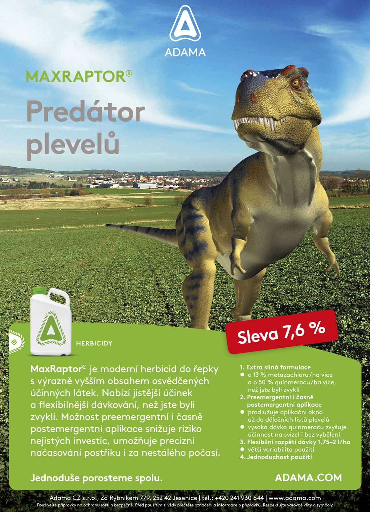 MaxRaptor je účinný herbicid do řepky s vysokým obsahem osvědčených účinných látek. Nabízí jistější účinek a flexibilnější dávkování. Možnost preemergentní i časně postemergentní aplikace snižuje riziko nejistých investic, umožňuje precizní načasování postřiku i za nestálého počasí. Na rozdíl od podobně koncipovaných produktů lze MaxRaptor použít i na svažitých pozemcích, jejíž okraje jsou vzdáleny méně než pět metrů od povrchových vod. Navíc jeho aktuální cena je nyní snížena o 7,6 % (z 1190 Kč/l na 1099 Kč/l).