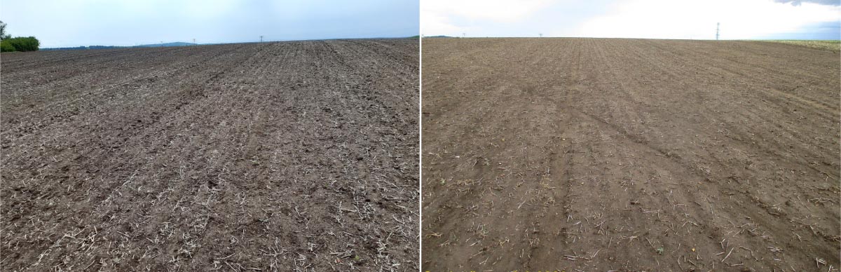 Obr. 1: Porost sóji totálně zlikvidován holuby (Studeněves 4. 6. a 18. 8. 2020)