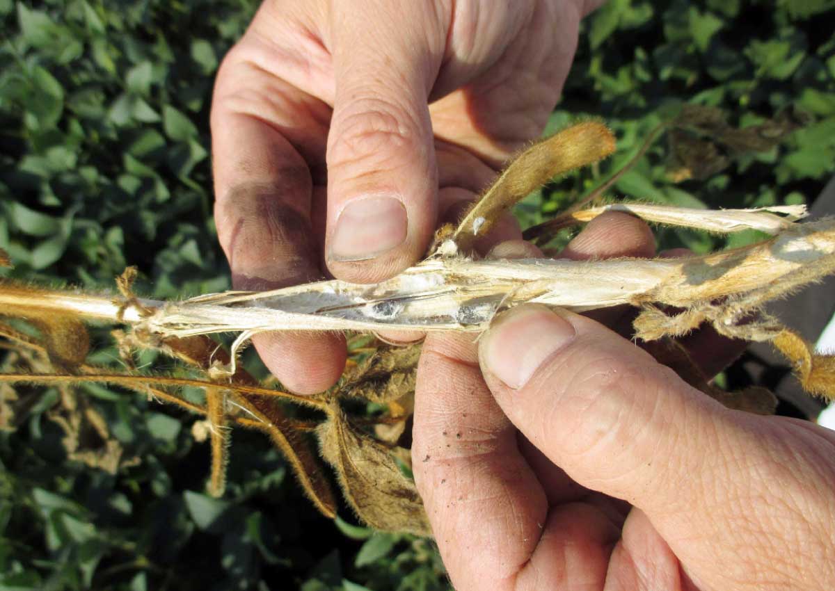 Hlízenka (Sclerotinia sclerotiorum) se na většině porostů sóji téměř nevyskytovala (celkově lze tento rok hodnotit z pohledu hlízenky jako slabší), avšak několik hlášení o silném výskytu, zejména ze severní Moravy jsme obdrželi (obr. 2). Vzhledem k vyšší vlhkosti, způsobené nadměrnými srážkami na některých lokalitách, jsme v pozdnějších fázích zaznamenali mírně vyšší výskyt peronospory (Peronospora manshurica) než v předchozích letech (s nekrotickými projevy na listech).
