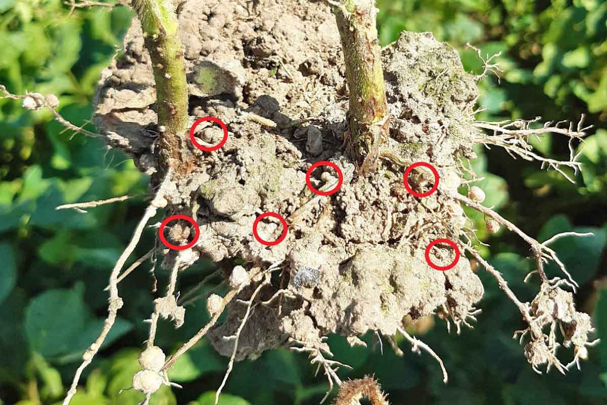 V loňském roce jsme však poměrně často pozorovali řadu abiotikóz. V průběhu silně podnormálního května jsme se na porostech sóji setkávali s chladovou žloutenkou. Růst sóji se v tomto období výrazně zpomalil, což všeobecně nahrává konkurenci plevelů. Poškození sóji kroupami se vyskytovalo v průběhu celé vegetace lokálně a někdy i opakovaně, např. na lokalitě Skalička proběhlo 2× krupobití během vegetace. Paradoxně jsme se v roce 2020 poměrně často setkávali s abiotikózami spojenými s přívalovými dešti a přemokřením. Nadbytek vody v půdě způsobuje zánik plynné fáze půdy, a tím nedostatek kyslíku pro kořenové dýchání. Naopak dochází k akumulaci CO2 uvolňujícího se rozkladem půdní organické hmoty. V půdě probíhají anaerobní a redukční procesy a produkty těchto přeměn po dosažení koncentračního prahu se stávají pro rostliny toxické. Dlouhodobější zaplavení vyvolává rovněž disociaci půdy, ničení její struktury, a tím její zvýšenou sléhavost. Rostliny v těchto podmínkách omezují především dýchání kořenů, tím je narušen příjem vody, živin a transpirace. Snižuje se transport vody i živin do nadzemních částí. Průduchy se zavírají (nedostatek turgoru), mohou se objevit symptomy deficitu řady živin. Uvedené skutečnosti mají negativní vliv na tvorbu výnosu. Příkladem anaerobního prostředí je i obrázek 3, kde jsou označené hlízky, které se na rostlině objevovaly v pozdnější fázi a velmi často na povrchových kořenech - na povrchu půdy.