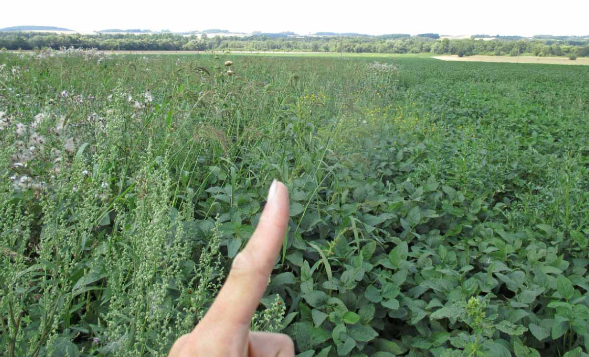 Jako každým rokem účinnost preemergentních herbicidů ovlivňovalo množství srážek po jejich aplikaci. Z pohledu celé ČR lze hodnotit měsíc květen za srážkově normální (74 mm - 107 % N). Určitý vliv na slabší účinnost herbicidů mohly mít silně podnormální teploty v průběhu května, které zpomalily růst sóji, čímž se zvýšila konkurenční schopnost plevelů. V řadě případů proto bylo účelné aplikovat postemergentní herbicidy. Obdobně jako v předchozích letech růst sóji nejvíce retardovalo silné zaplevelení, které bylo patrné jak na herbicidně neošetřené - kontrolní variantě (obr. 4), tak i na postemergentně ošetřeném porostu.