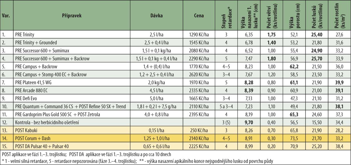 Volba konkrétního herbicidu, resp. herbicidní kombinace, však vždy závisí na plevelném spektru, agroekologických podmínkách daného stanoviště a riziku možné fytotoxicity použitých přípravků k rostlinám sóji. V neposlední řadě o použití herbicidní kombinace rozhoduje i její cena. Podrobnější výsledky z ověřování jednotlivých herbicidních kombinací jsou uvedeny v tabulce 1.