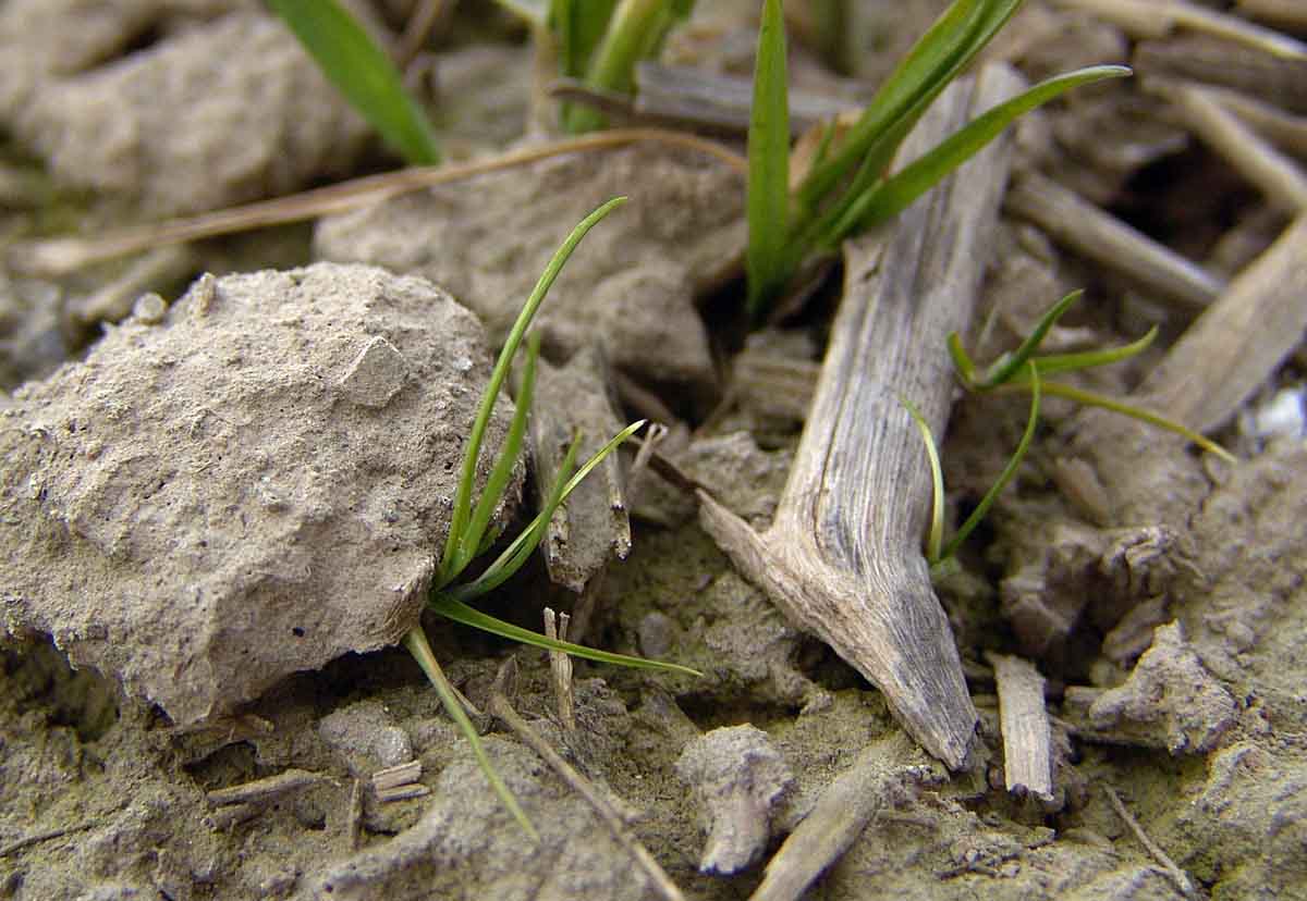 Obr. 1: Po zeslábnutí reziduálního působení půdních herbicidů mohou plevele (na obrázku lipnice roční) vzcházet zpod hrud a rostliných zbytků na povrchu půdy