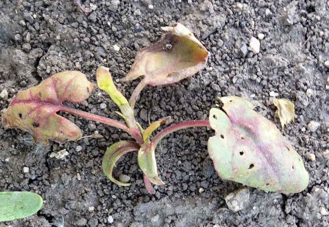 Typické poškození ježatky kuří nohy (antokyanové zabarvení listů) sulfonylmočovinou (Maister) - 2 týdny po aplikaci