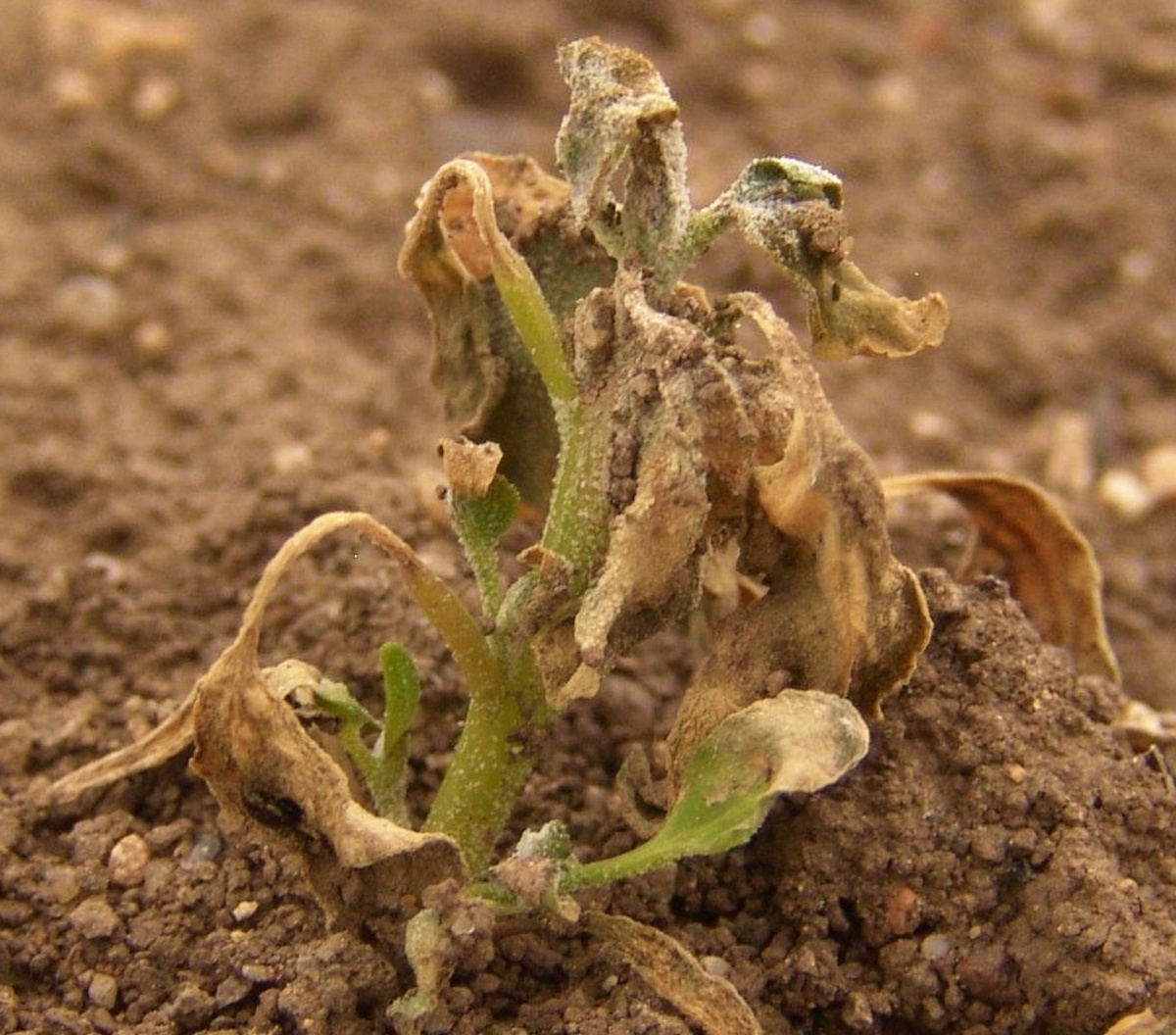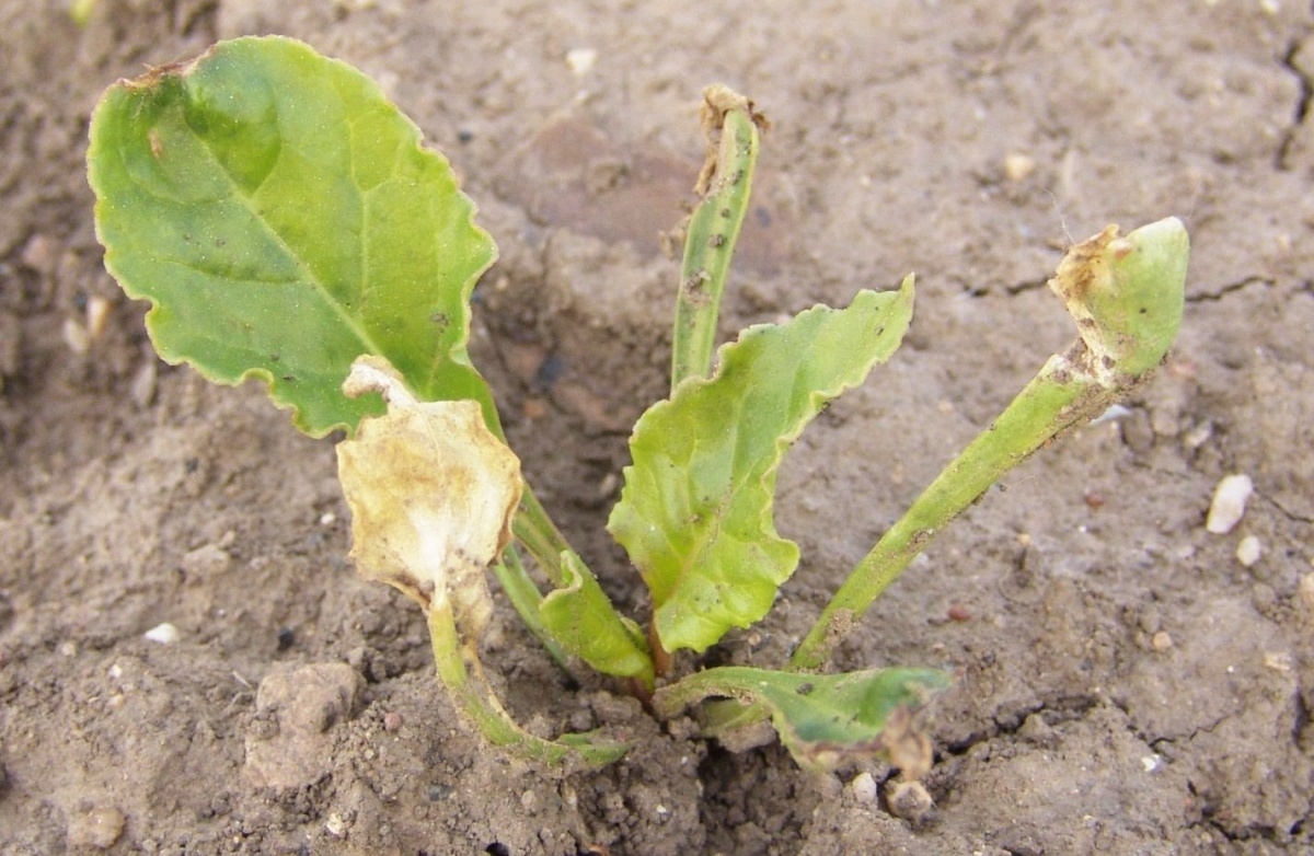 Obr. 5: Pokud je ošetření kontaktními herbicidy (phenmedipham, desmedipham) provedeno příliš pozdě, mohou plevele regenerovat, přestože, jejich listová plocha byla zcela zdesikovány (regenerace z adventivních výhonů)