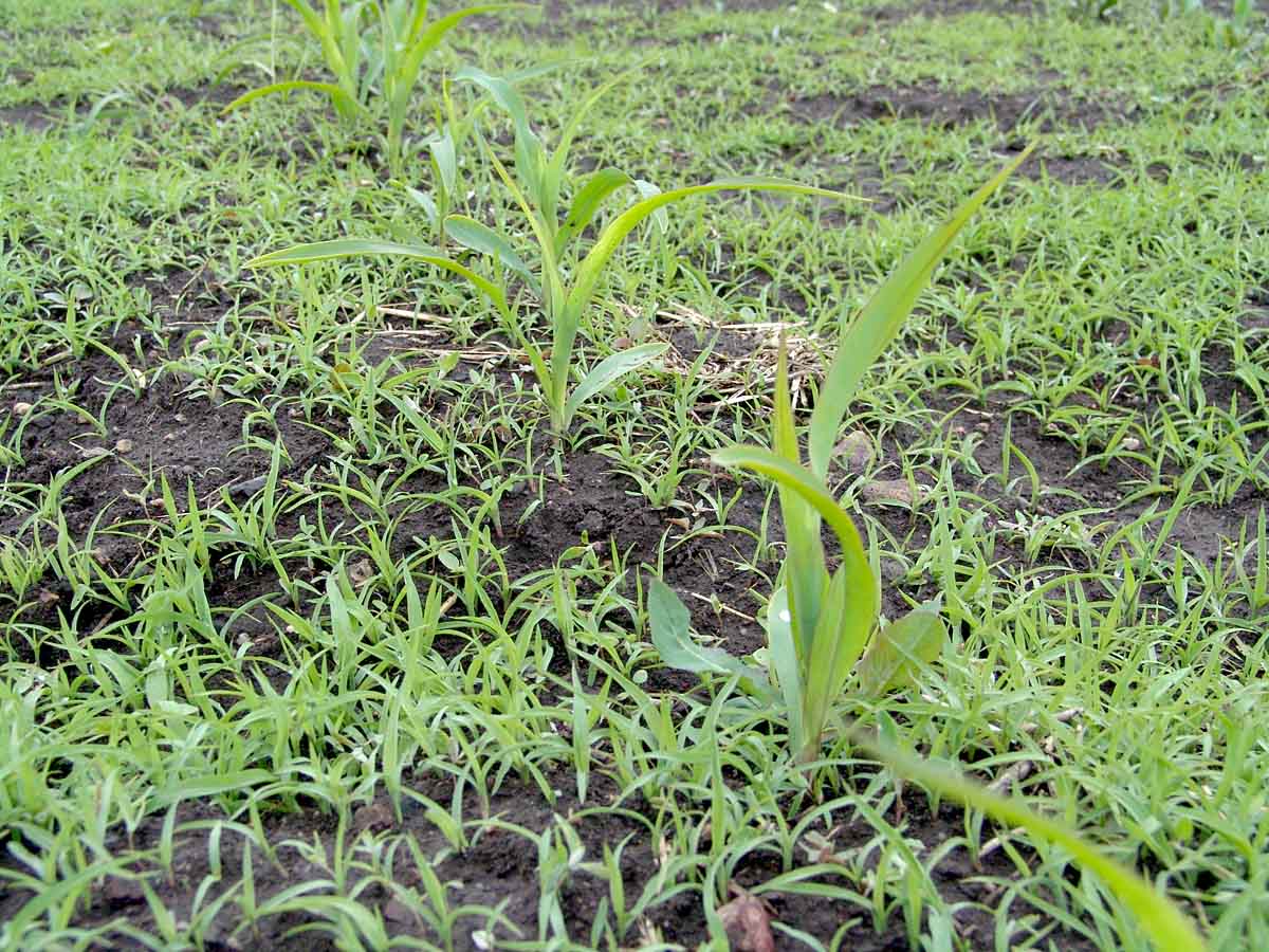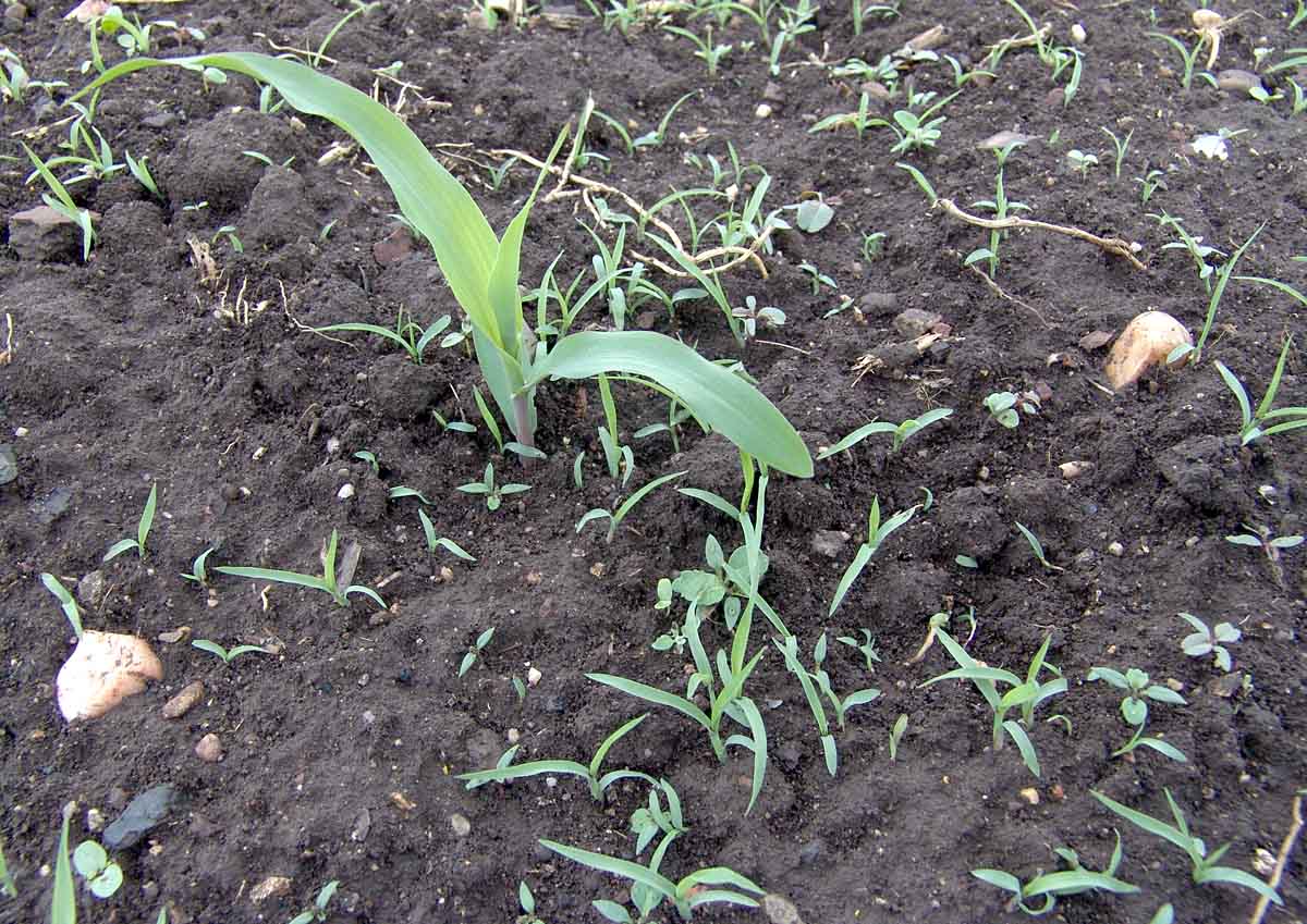 Obr. 1: V této růstové fázi plevelů již není vhodné použití půdních herbicidů a je třeba přistoupit k ošetření herbicidy, které působí především skrze listy; půdní herbicidy však mohou být použity jako pojistky pro zamezení vzcházení nových plevelů