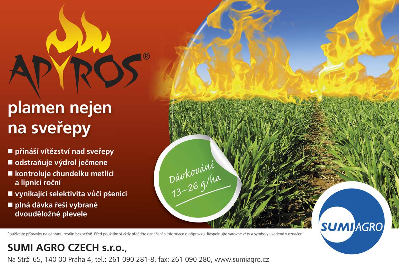 Pokusy a praxe ukazují, že velice spolehlivým řešením nejen sveřepů, ale i chundelky metlice, lipnice roční, pýru, výdrolu ječmene a celé řady dvouděložných plevelů (heřmánky, svízel, rdesna, kakost, řepka) v porostech jarních a ozimých pšenic je letošní novinka Apyros. Jde o sulfonylmočovinu vyvinutou japonskou firmou Takedo patřící od roku 2007 do korporace Sumitomo.