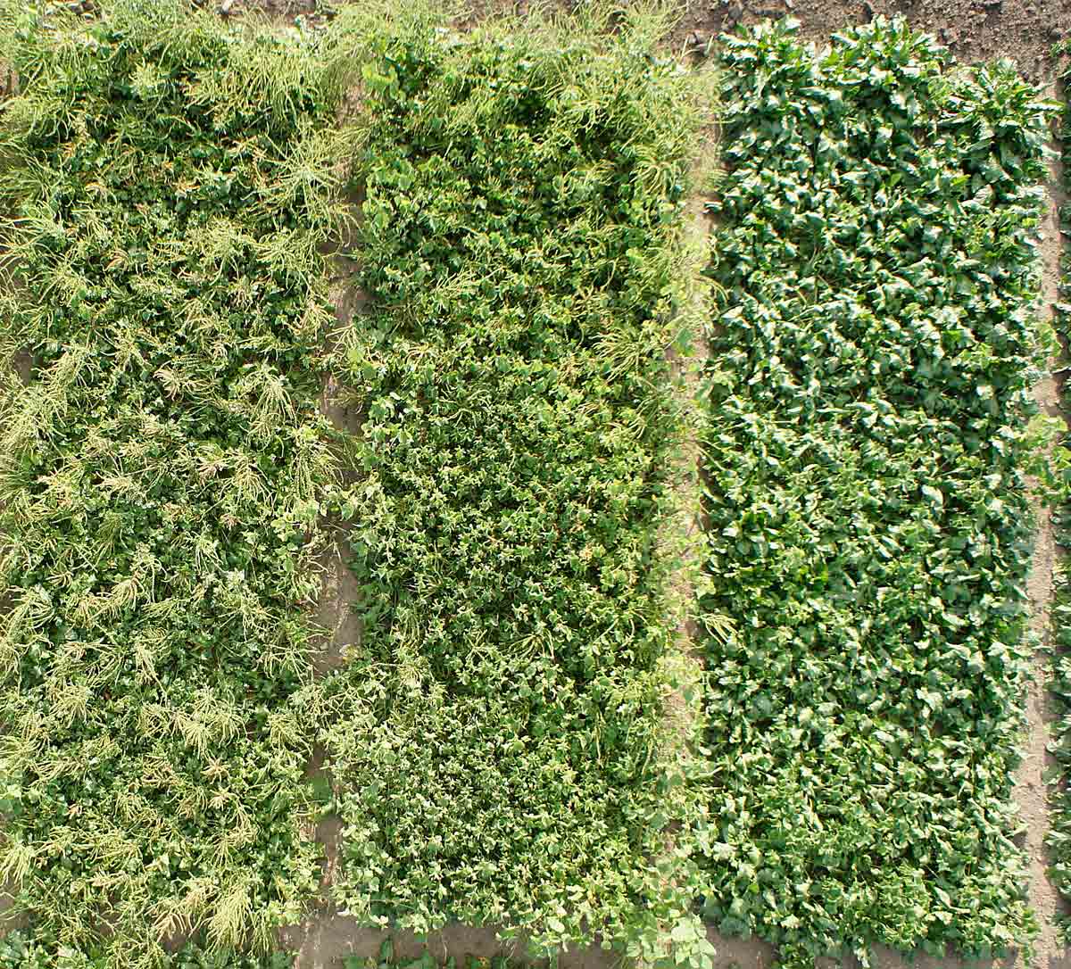 Obr. 2: Conviso Smart cukrovka - levá parcela je konvenční varianta ošetřena 3× Betanal maxxPro + Safari (na pozemku přežívá mračňák Theophrastův), prostřední parcela je konvenční varianta ošetřena 3× Betanal maxxPro (přežívá plevelná řepa), pravá parcela je ošetřena přípravkem Conviso One (bez plevelů)