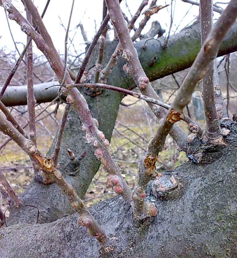 Vzhledem k aktivitě mšic v roce 2020 je vhodné projít ohniska napadení a zkontrolovat výskyty diapauzních vajíček. Totéž platí i pro přezimující L1 a L2 nymfy vlnatky, jež si v posledních mírných zimách zvykla na úspěšné přežívání na kmenech, kosterních větvích i poškozených letorostech. Poškozené letorosty bychom měli během řezu, pokud možno, odstranit, neboť pupeny s nádory mají nižší vitalitu nebo vůbec nevyraší. Všímat bychom si měli i vajíček svilušek, píďalek, můr a dalších živočichů připravených nám v nadcházející sezoně opět komplikovat život. S tradičním ošetřením oleji, pokud bude podle výsledků monitoringu potřebné, pochopitelně počkáme až do nástupu vegetace.