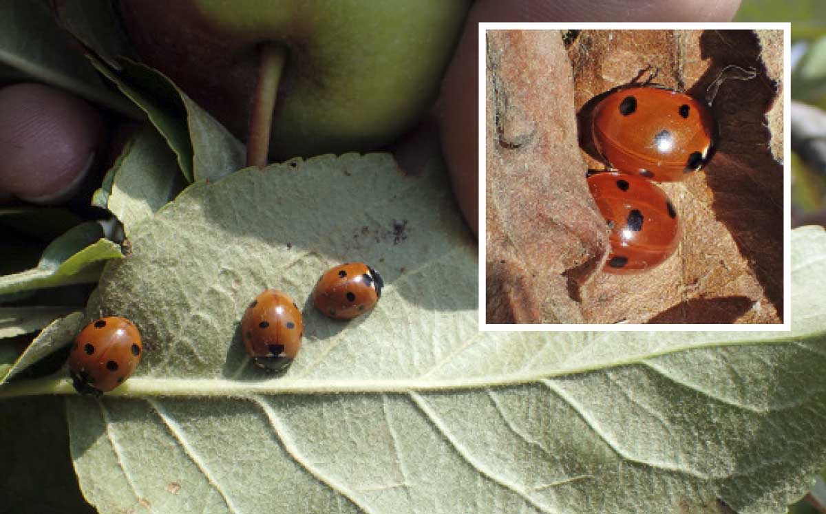 Slunéčka byla letos nejhojnějšími afidofágy po celou vegetaci až do sklizně - v detailu jedinci vyhledávající na podzim úkryty v uschlém listí