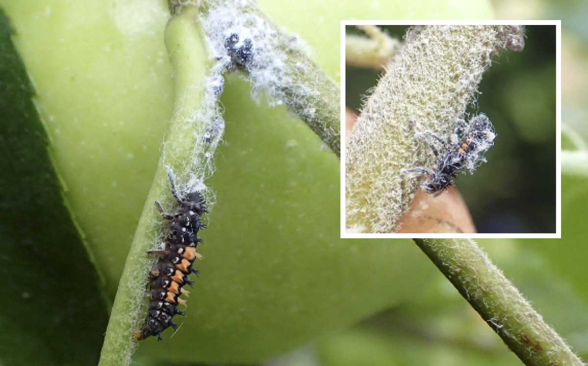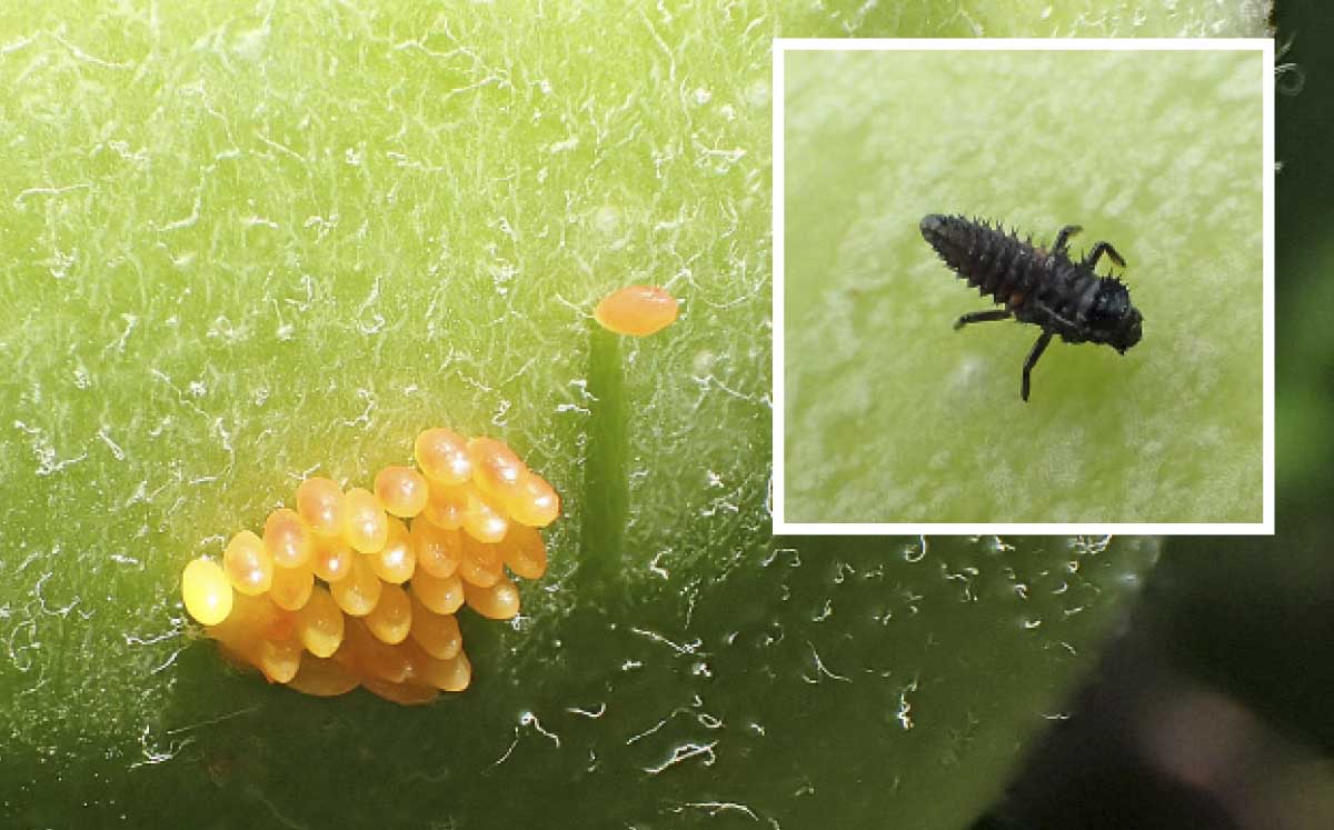Snůška vajíček slunéčka na plodu a čerstvě vylíhlá larva