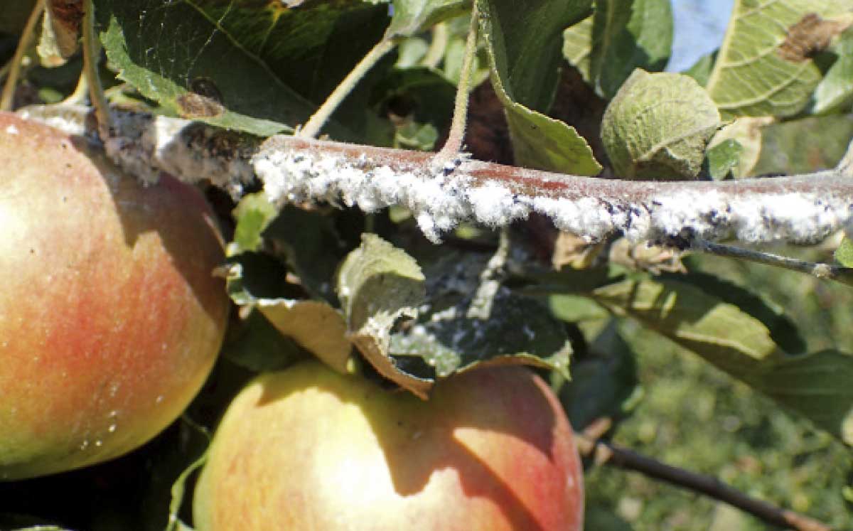 Obdobný přístup je třeba zvolit i v případě vlnatky krvavé (Eriosoma lanigerum), jejíž očekávaný nástup byl díky březnovým mrazům zmírněn, avšak během léta a také před sklizní vlnatka zmobilizovala svůj potenciál, hlavně ve starších a bujněji rostoucích výsadbách. Zdá se, že vlnatce také více prospívají mikroklimatické podmínky pod ochrannými sítěmi. Obdobně jako u běžných mšic blízkost kolonií hojně vyhledávali přirození nepřátelé, jako slunéčka, zlatoočky, pestřenky a další organizmy. Klíčovým regulátorem vlnatky je však parazitická vosička mšicovník vlnatkový (Aphelinus mali), bohužel citlivá vůči aphicidně využívaným neonikotinoidům i chloryripfos-methylu.