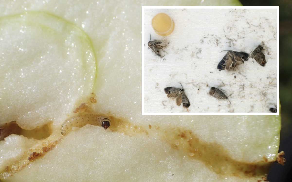 Večerní teploty se téměř kontinuálně udržovaly nad prahem pro kladení obaleče jablečného (Cydia pomonella), což naznačovalo silný tlak škůdce. Úlovky v lapácích se objevily o 14 dnů dříve než obvykle a tento posun se projevil i v časnějším nástupu druhé generace - i když hranici mezi oběma generacemi bylo vzhledem k nepřetržitému kladení obtížné odlišit. Ve výhodě byli sadaři využívající feromonové matení, neboť touto metodou lze efektivně pokrýt celou sezonu a insekticidní zásahy omezit pouze na extrémní situace. V sadech se běžně vyskytovaly úlovky v desítkách jedinců za 3–4 dny, výjimečně i stovek kusů za týden. Hlavní škody na úrodě vznikly hlavně během vrcholu letu druhé generace (přelom července a srpna). Extrémní vedra a sucho během srpna škůdci úplně neprospívaly, avšak čerstvé závrtky s L2-L3 housenkami bylo možno v sadech nalézat i těsně před sklizní hlavních odrůd. Průběh aktivity obaleče jablečného ve vztahu k vývojovým stádiím je obdobně jako u pilatky znázorněn na výstupu modelu RIMpro.