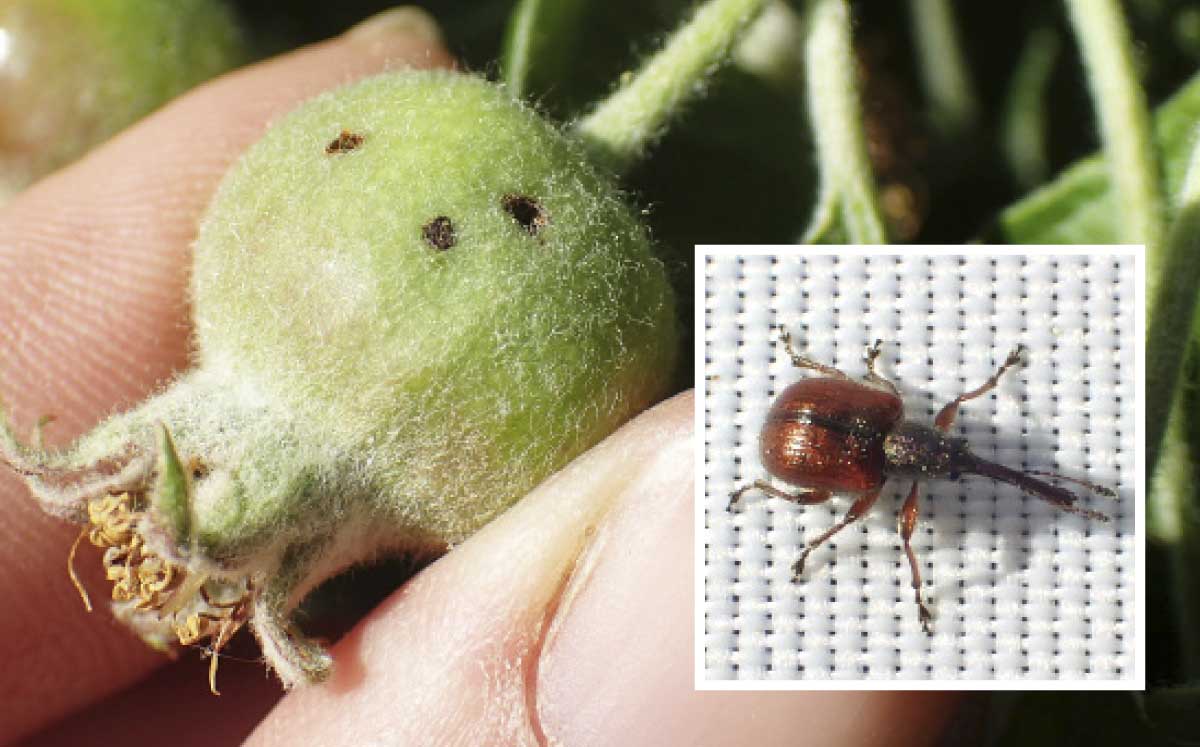 Přesné stanovení termínu ošetření vyžaduje i květopas jabloňový (Anthonomus pomorum), jehož dospělci projevují aktivitu v relativně krátkém časovém úseku hned na počátku rašení. Kvůli březnovým mrazům jsme očekávali posun termín adulticidního ošetření na později, ale oteplení vývoj urychlilo natolik, že ke konci prvního dubnového týdne mohlo být na likvidaci brouků již pozdě. Hromadný výlet květopasů během pár dnů však umožnil zasáhnout většinu populace jedinou aplikací. Kukly nové letní generace byly vyvinuty již na počátku května a noví brouci opouštěli napadené květy v polovině měsíce.