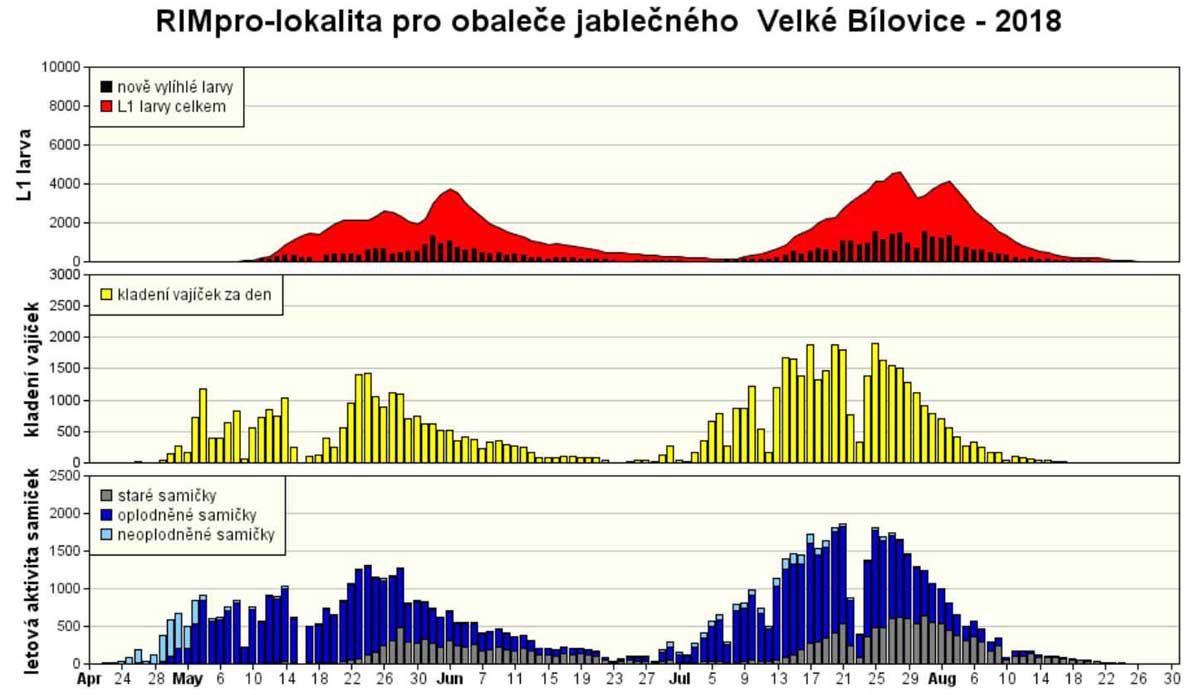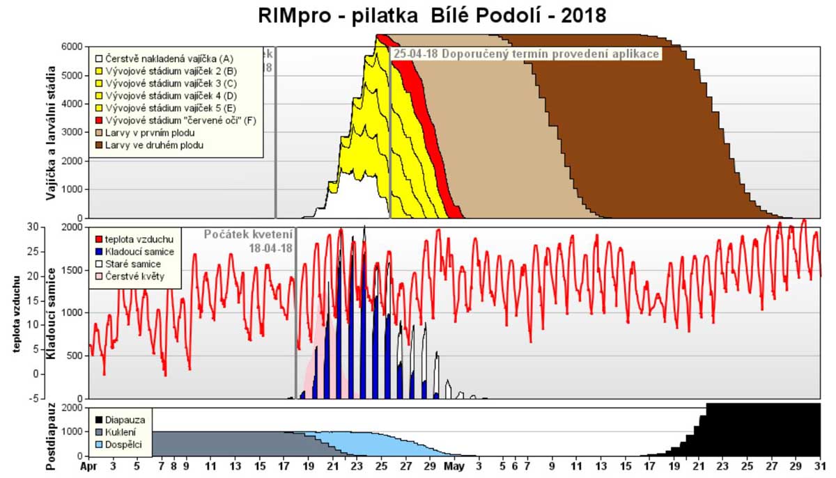 První výskyty pilatky jablečné (Hoplocampa testudinea) jsou vázány na otevření královských květů raně kvetoucích jabloní (letos druhá až třetí dekáda dubna), jež nalétávající samice při kladení preferují. Pokud upřednostňujeme zásahy proti dospělcům, aplikujeme adulticid zhruba ve fázi růžového poupěte až balónku, čímž zároveň řešíme i ochranu proti mšicím (viz dále). Volíme-li raději larvicidní ošetření (ve fázi červených očí), musíme s termínem cca 10 dnů počkat. Vhodnou pomůckou při signalizaci je teplotní model RIMpro - příklad výstupu modelu přehledně zobrazuje průběh vývoje škůdce v roce 2018 a signalizaci larvicidního zásahu (letos poslední dekáda dubna). V programu je k tomuto účelu nutné včas nastavit tzv. biofix (termín, k němuž se vztahuje výpočet SET) - v daném případě počátek květu.